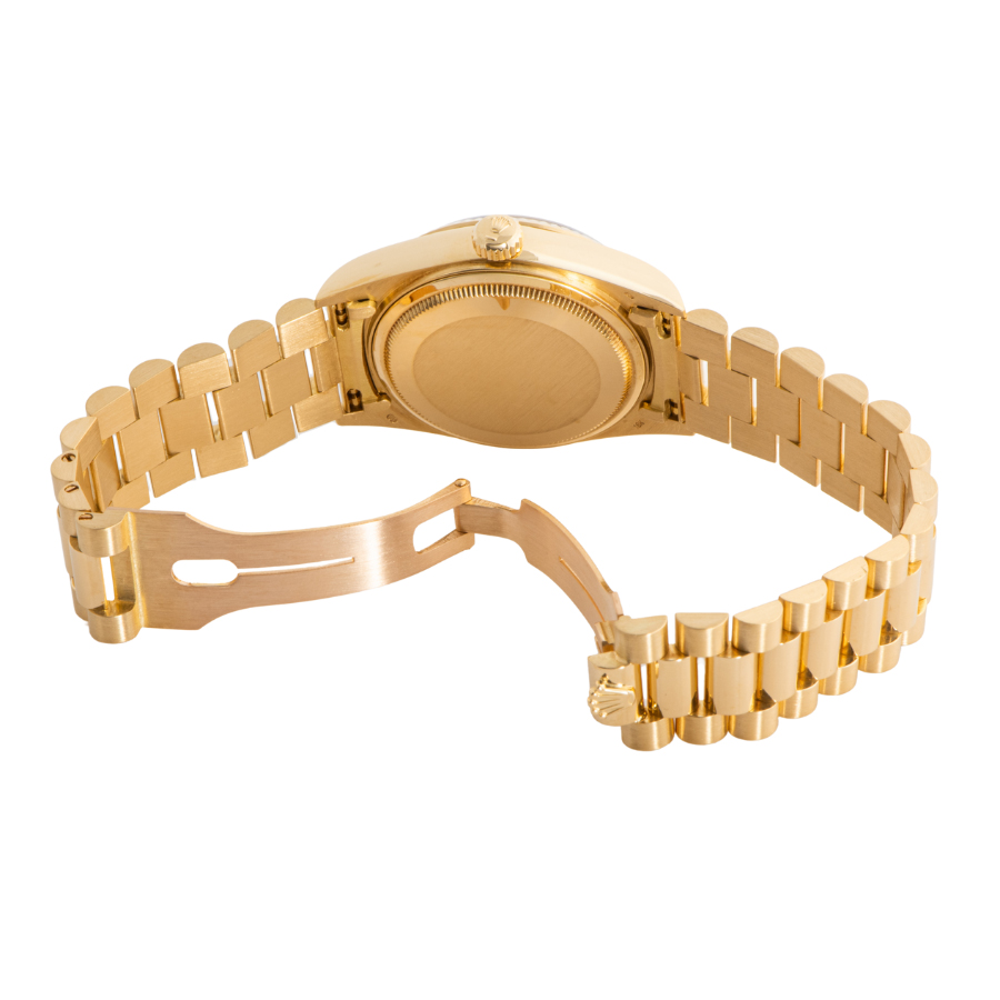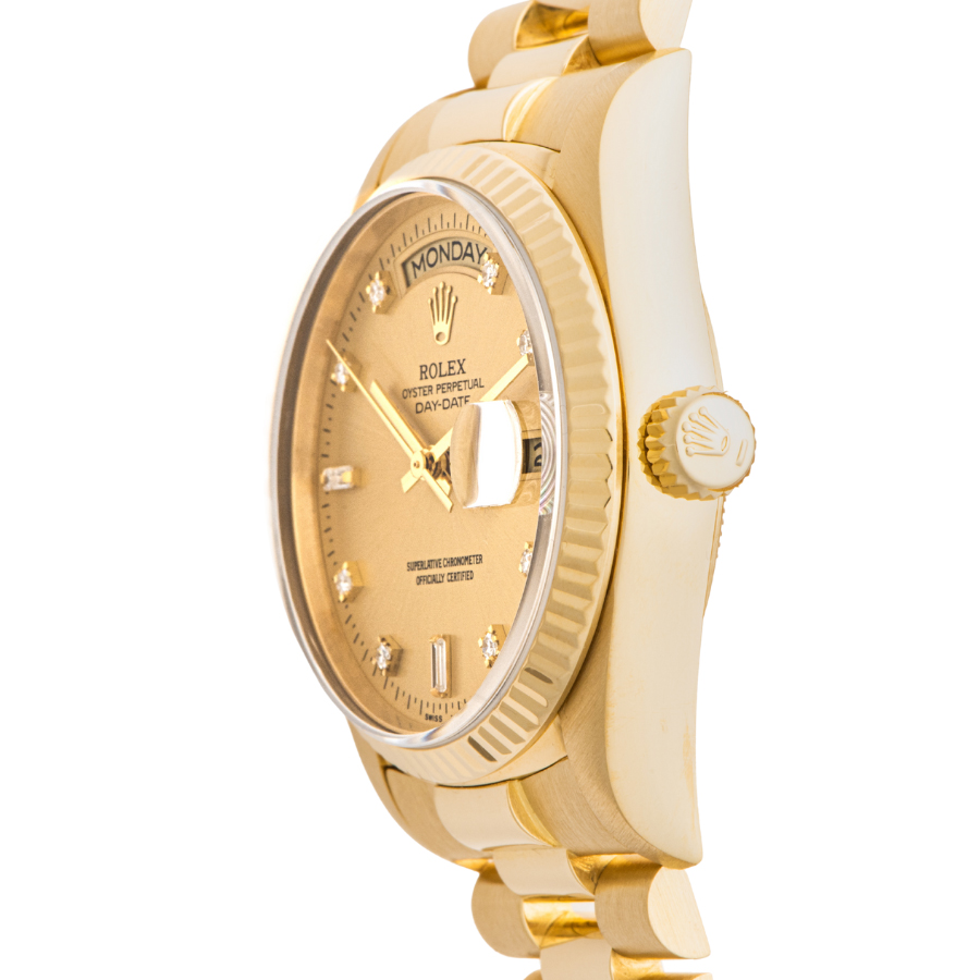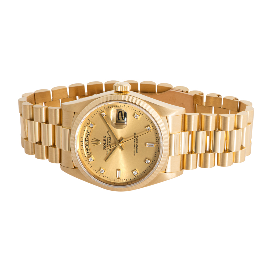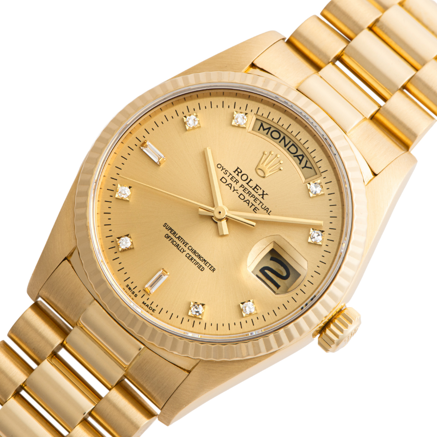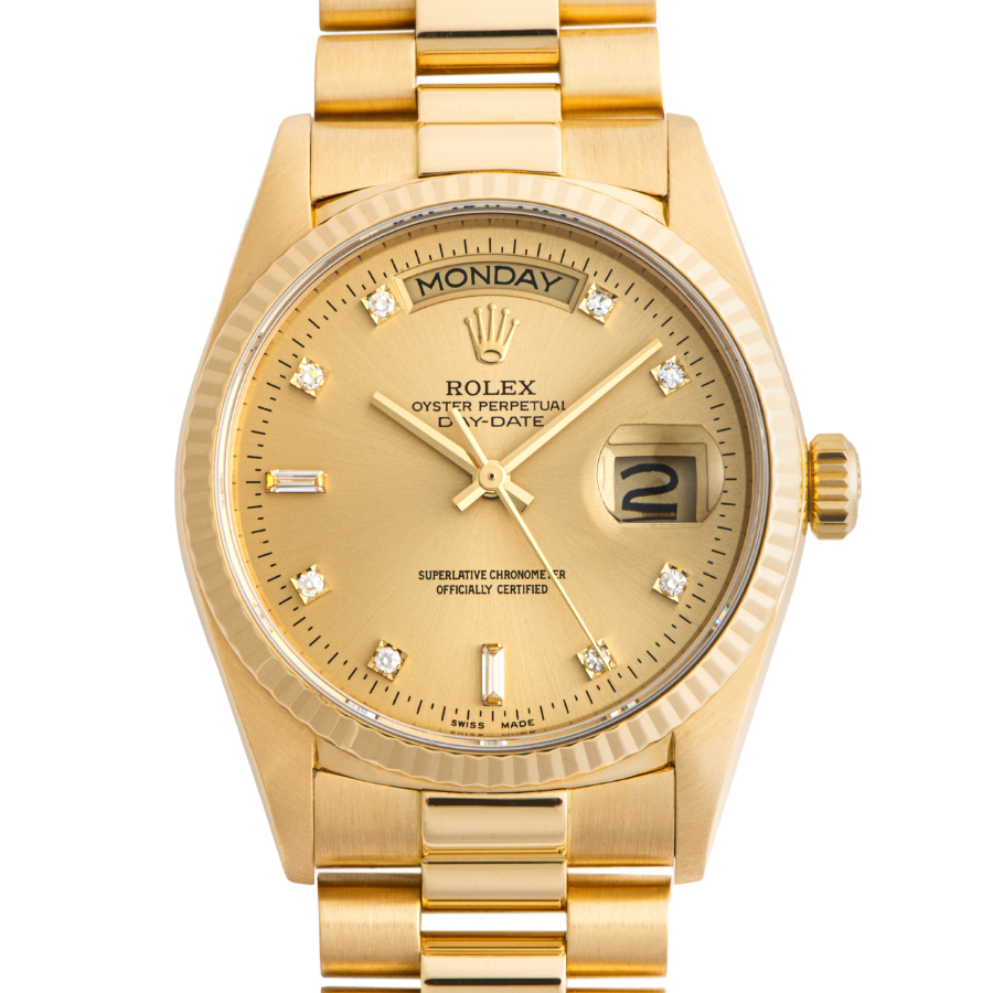 | 商品説明 | ☆ロレックスの最高峰ライン「デイデイト」。18Kイエローゴールド製ケースに、ダイヤモンドインデックスを添えた華やかな一本です。 36mmケースにフルーテッドベゼル、曜日と日付をフル表示するデイデイト機構を搭載。重厚感と品格を兼ね備えたデザインは、まさにステータスシンボル。 |