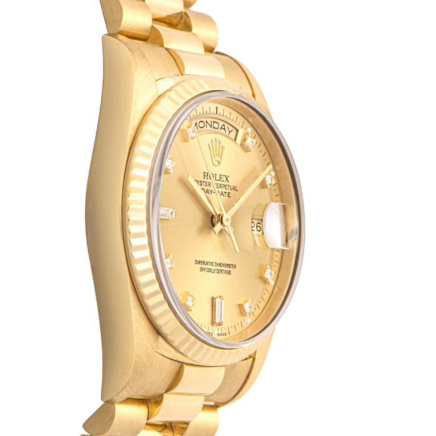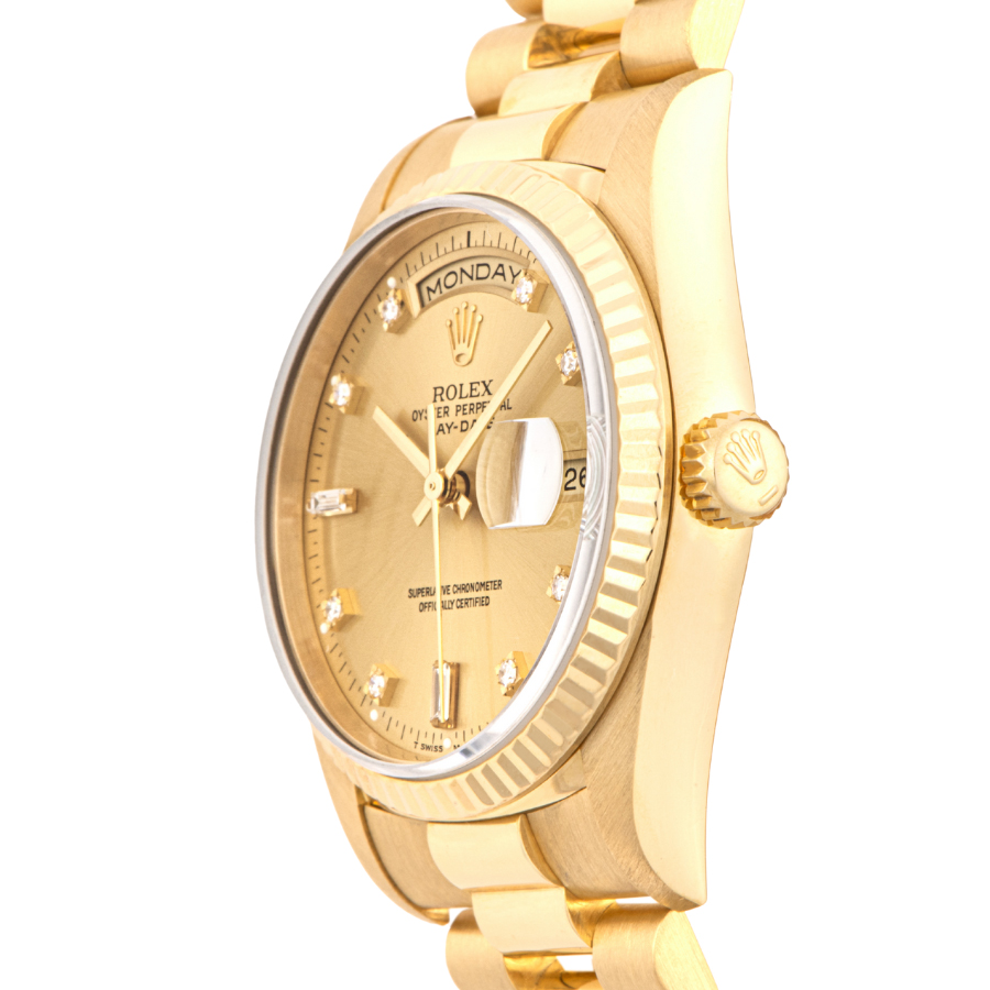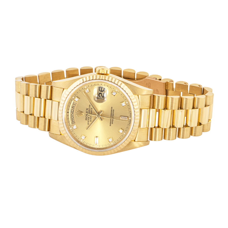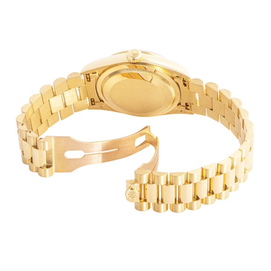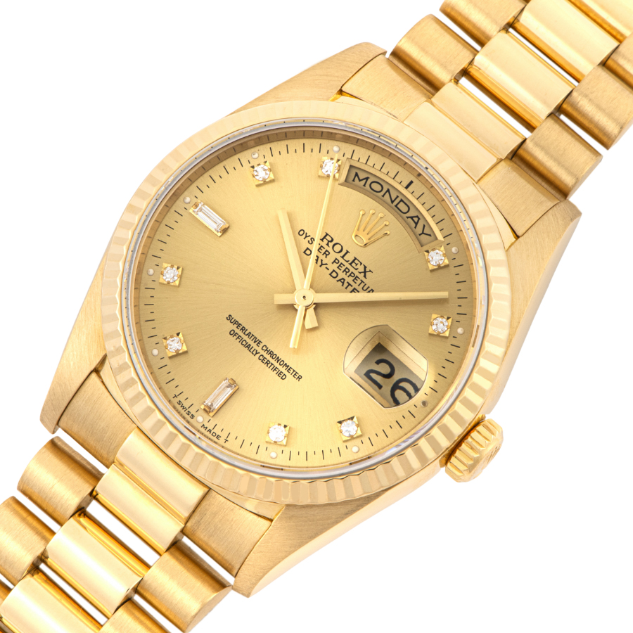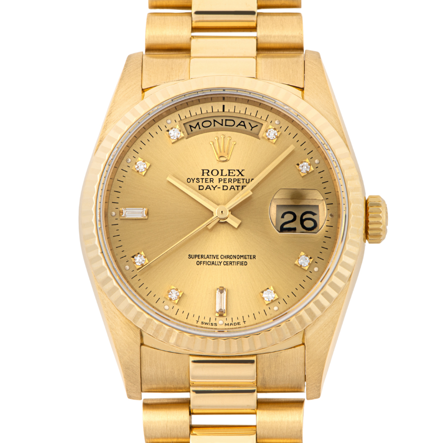 | 商品説明 | ☆ロレックスの最上位モデル「デイデイト」の中でも、ダイヤモンドインデックスを備えたラグジュアリーな一本。ケースとブレスレットには18Kイエローゴールドを使用し、気品と重厚感を兼ね備えています。 |