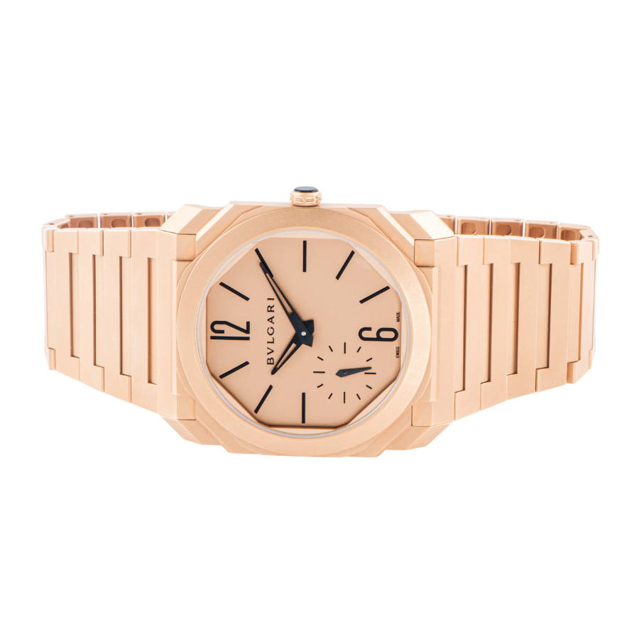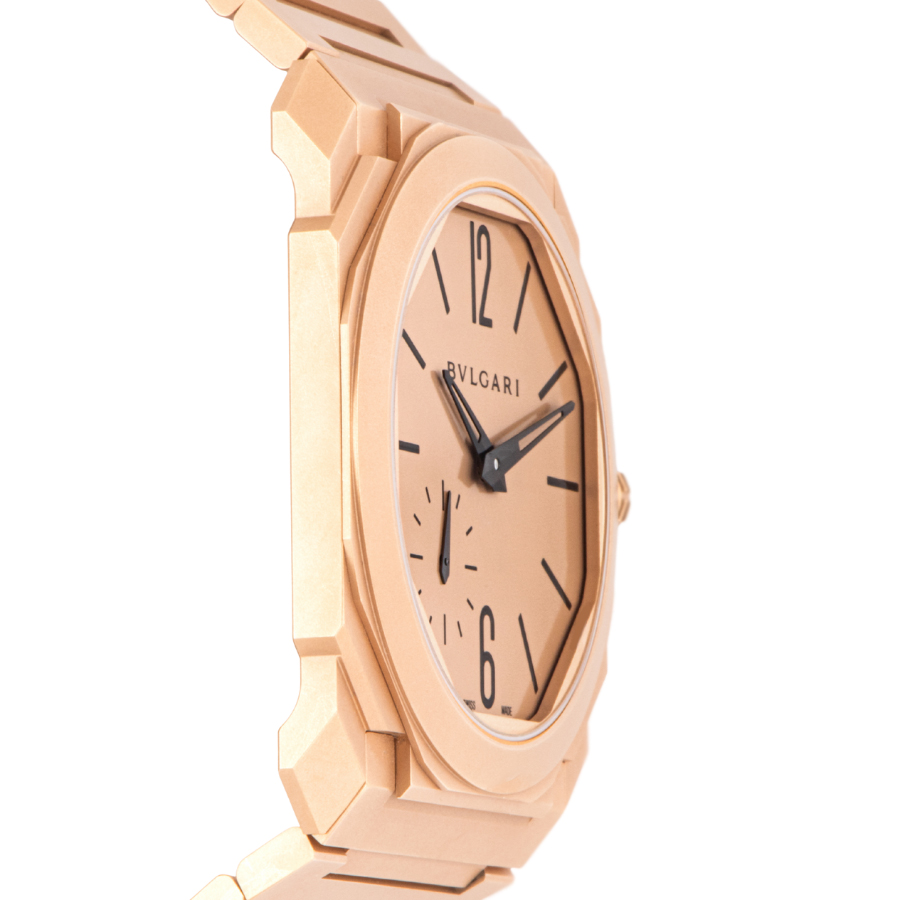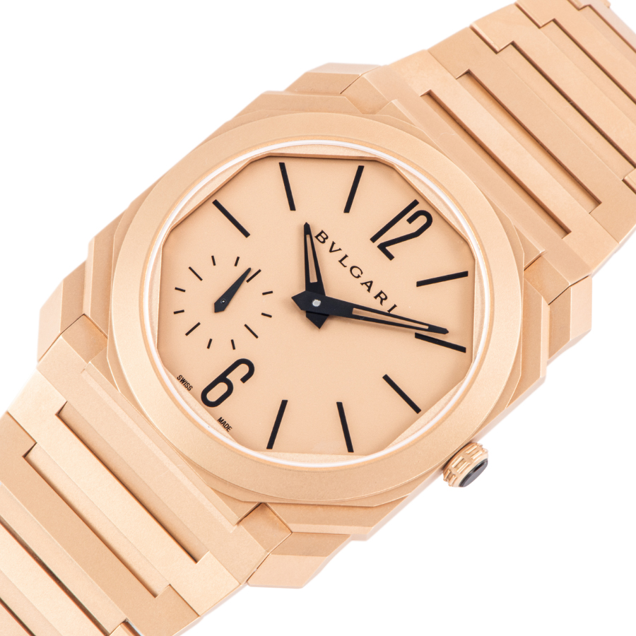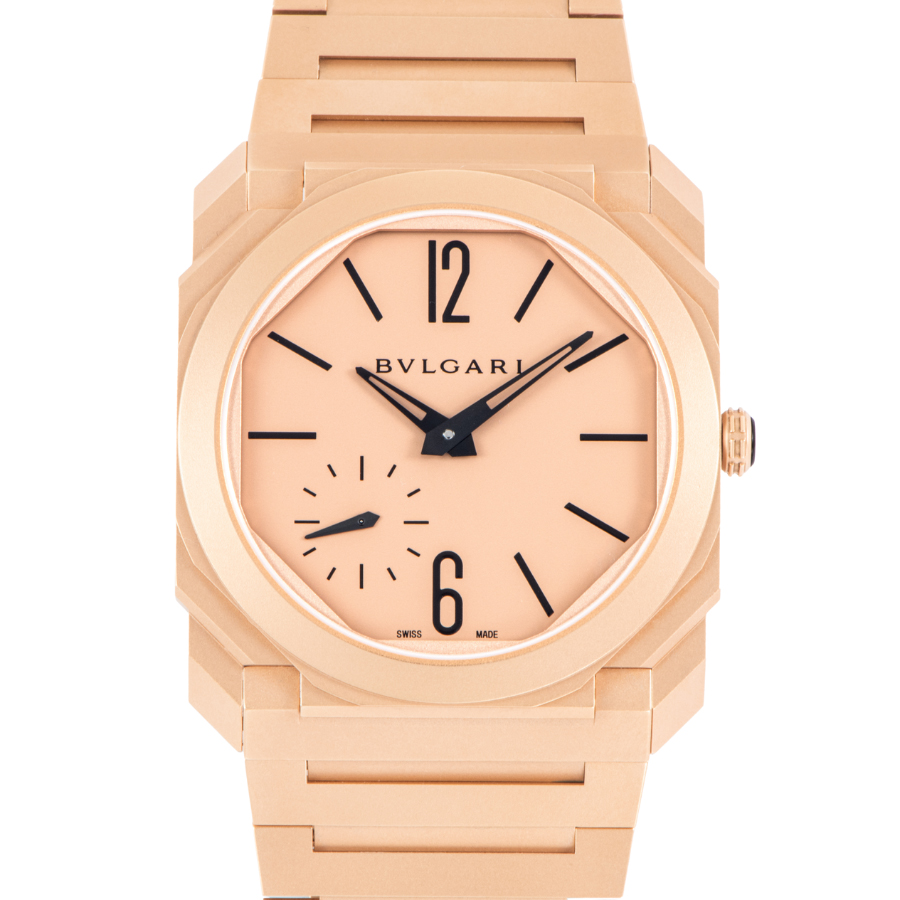 | 商品説明 | ☆角のある建築的なフォルムに、あえて艶を消した18Kピンクゴールド。 サンブラスト仕上げのマットゴールドが光を柔らかく吸い込み、「存在感はあるのに主張しすぎない」そんな独特の色気を纏ったオクト フィニッシモです。 厚さわずか約5.15mmの超薄型ケースに、自社製マイクロローター自動巻き(BVL138)を搭載。 スモールセコンドのみの潔い顔つきと、ケースとブレス一体のシャープな面構造が、手元をミニマルに引き締めます。 |