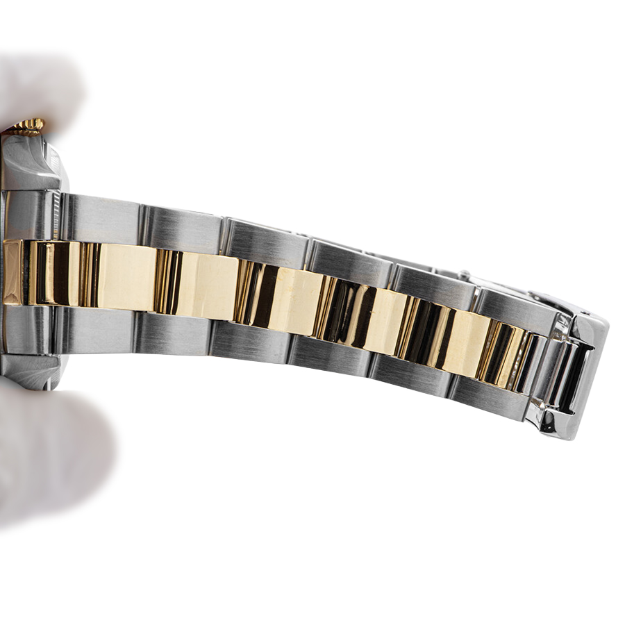 | コンディション | ガラス:12時付近の角に爪でなぞると引っかかる程度のガラス欠けがあります 文字盤・針:大変綺麗な状態 ベゼル:目立たない程度の小傷が僅かに残るが、大きな傷などなく大変綺麗な状態 ケース:4時方向に凹みの跡が薄っすらとあり、所々に小さな当て傷跡が僅かにのこるが、目立つ大きな傷などなく概ね綺麗な状態 ブレスレット:バックルに使用傷が残るが、目立つ傷はなく大変綺麗な状態 ※弊社で研磨仕上げ済み |