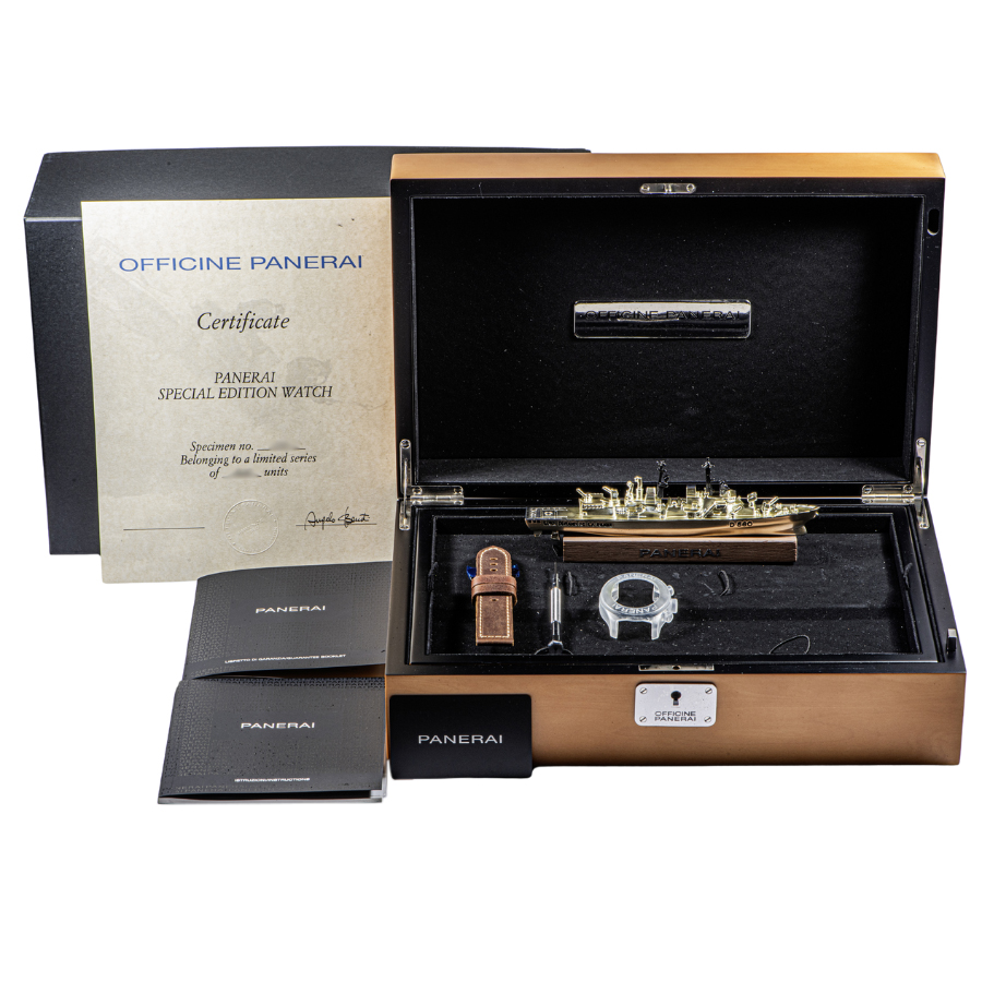 | 商品説明 | ☆パネライ史上初のクロノグラフ「マーレ ノストゥルム」の復刻版「PAM00716」は、世界1000本限定リリースで2017年のスペシャルエディションモデルです。 ブラウンカラーの替えレザーベルトとイタリア海軍駆逐艦の船舶模型が付属します。 |