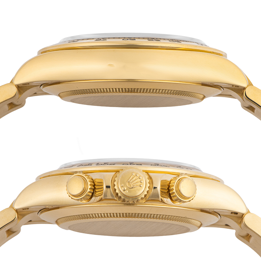 | 商品説明 | ☆2016年バーゼルワールド新作のデイトナK18YGモデルが入荷致しました。 ※ケースサイド9時方向に凹みが1箇所御座います。(写真参照) ブレスレットやバックルの鏡面仕上げ部分に微細な小傷があります。 2023/7にメーカーにてオーバーホール、研磨仕上げ、風防交換済みで目立つ大きな傷などはなく大変綺麗な状態です。 |