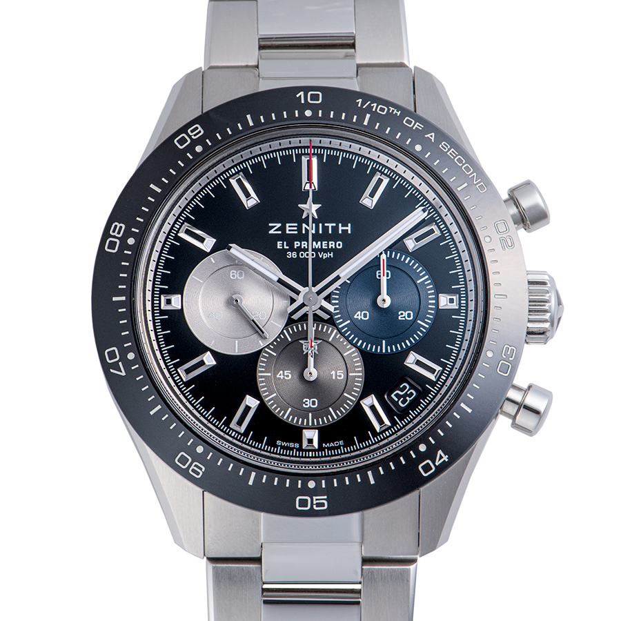 1/10秒単位の精度で経過時間を計測および表示する最新のエル・プリメロ クロノグラフ キャリバーを搭載したこのモデルは、現代的でありながら見間違えることのないゼニスらしいデザインを備えています。