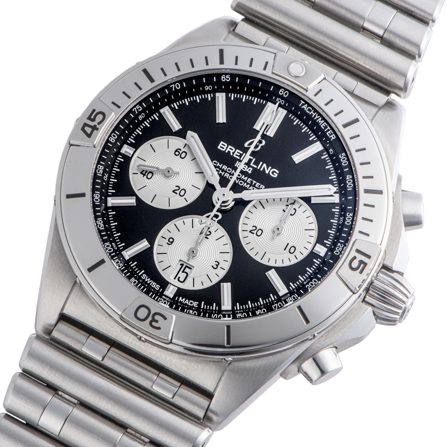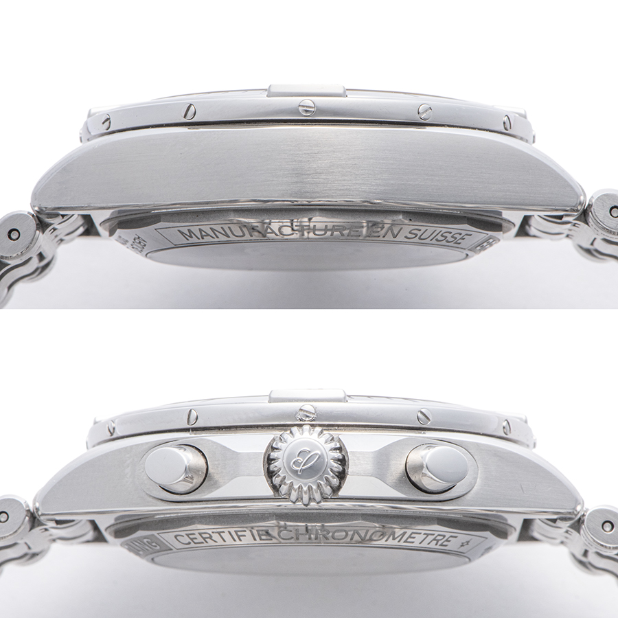| 商品説明 | ☆日本限定モデルではブラックとシルバーの文字盤にシルバーのクロノグラフ秒針を配置し、すっきりとした印象です。 非売品のブライトリング ジャケット付きです。 ※ケースサイド1時位置に薄い線傷、7時位置に小さな打ち傷がございます。 ラグ5時、11時位置に小さな擦り傷がありますが着用時、目立つ程ではございません。 その他には目立つ大きな傷等なく大変綺麗な状態です。 |