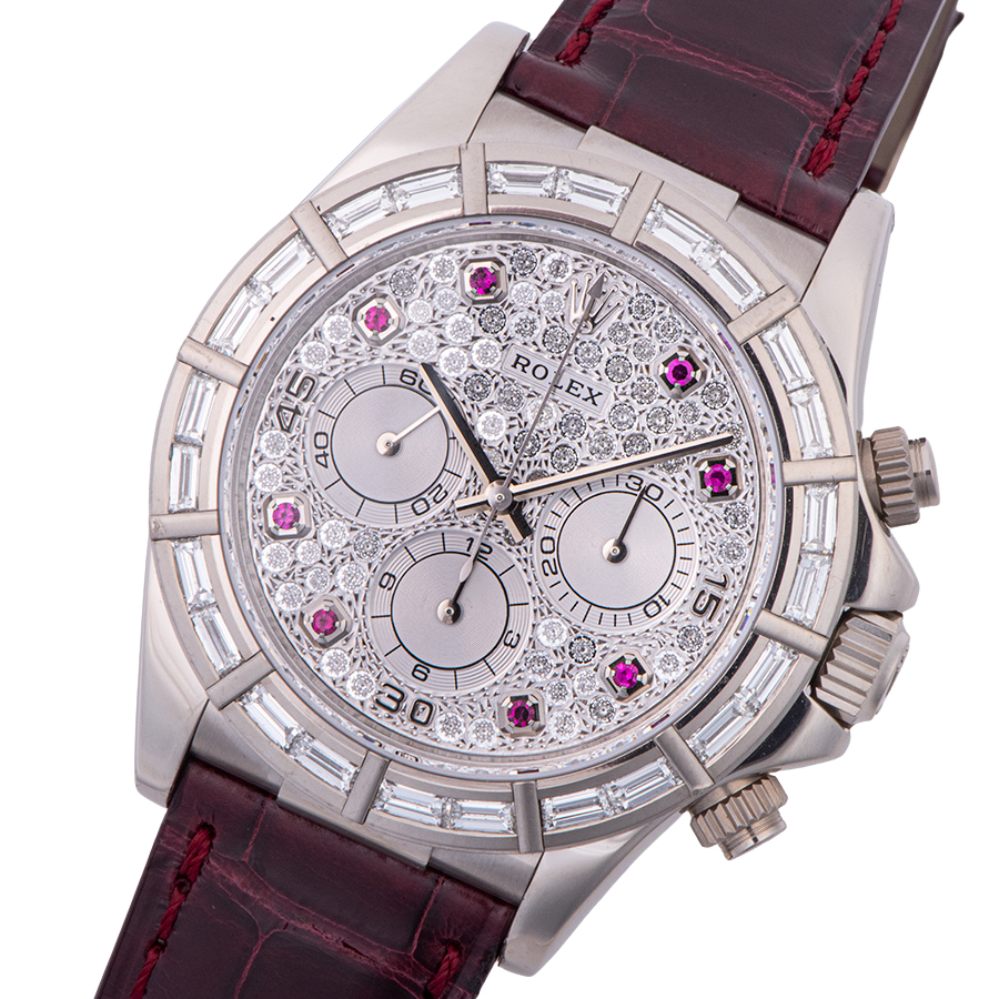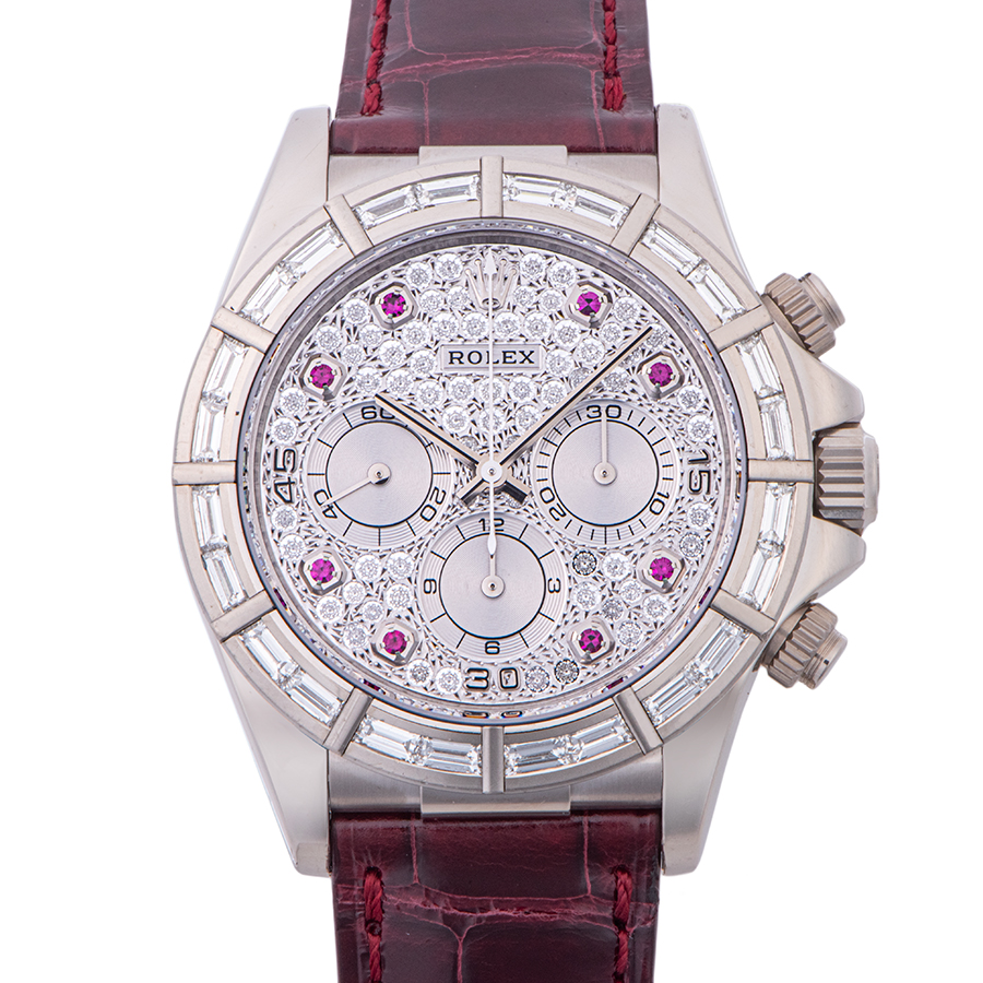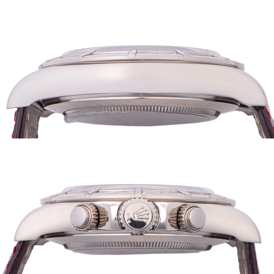 | 商品説明 | ☆市場でも流通が少なく大変希少価値の高いエルプリ搭載モデル、パヴェダイヤダイアルに8ポイントのルビーが映える一本です。 ベゼルにもバケットダイアをセットした豪華な仕様です。 ※2022/11にメーカーでOH済み。 ラグ正面1時・7時方向に打ち傷があり、ケースサイドに小さな打痕がポツポツと見受けられ、バックルに使用に伴う小傷があります。 その他の箇所には目立つ大きな傷や致命的なダメージはなく概ね綺麗な状態です。 新品純正革ベルトに交換済み。 |