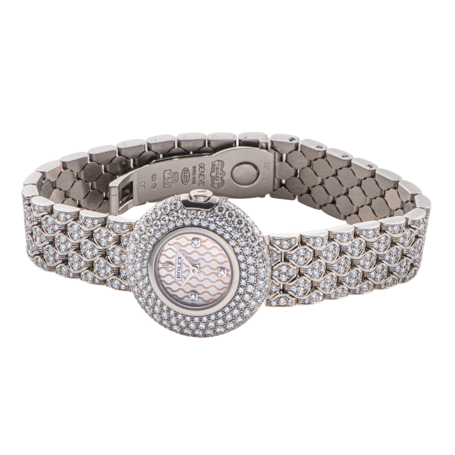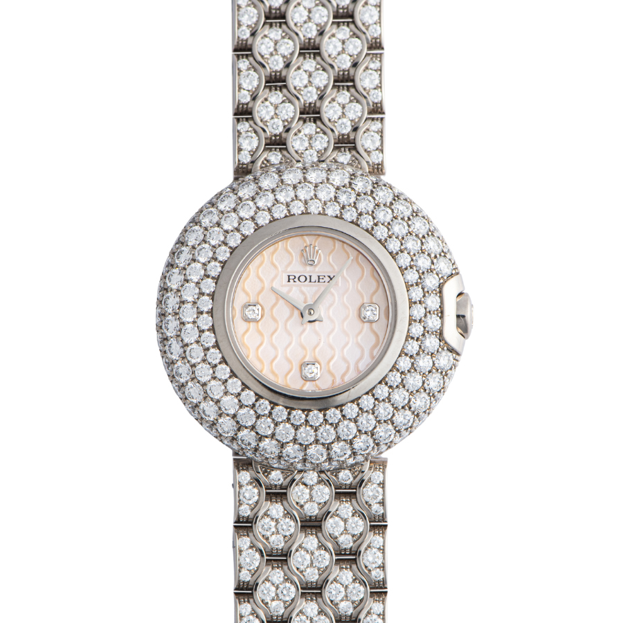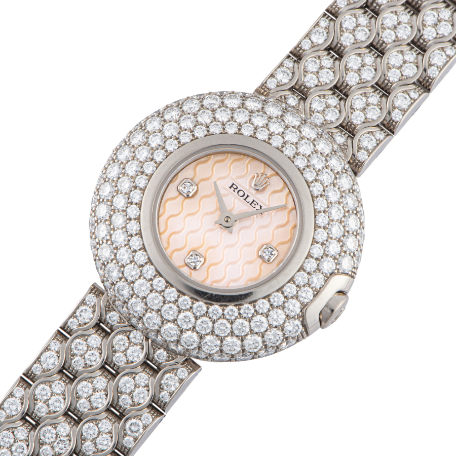 | 商品説明 | ☆ホワイトゴールド製のボディとブレスレット、ベゼルとブレスレットの全面にセッティングされたダイヤモンドはどこから見ても豪華。 ダイヤモンド入りマザーオブパールの文字盤にはウェーブの模様が描かれ、光が当たる角度によって様々な表情を見せて楽しませてくれます。 ※着用時目立たない程度の微細な拭き傷が鏡面部分にありますが目立つ大きな傷などなく大変綺麗な状態です。 ガラス傷やガラス欠けは見受けられません。 2024/1にメーカーにてオーバーホール済みです。 |