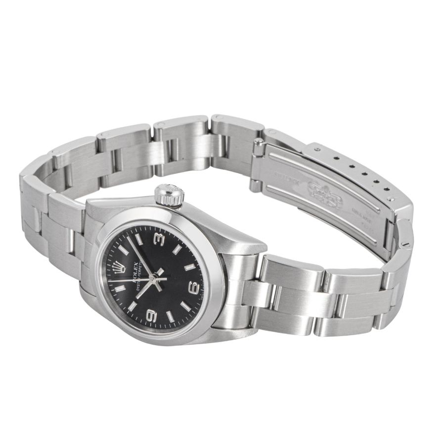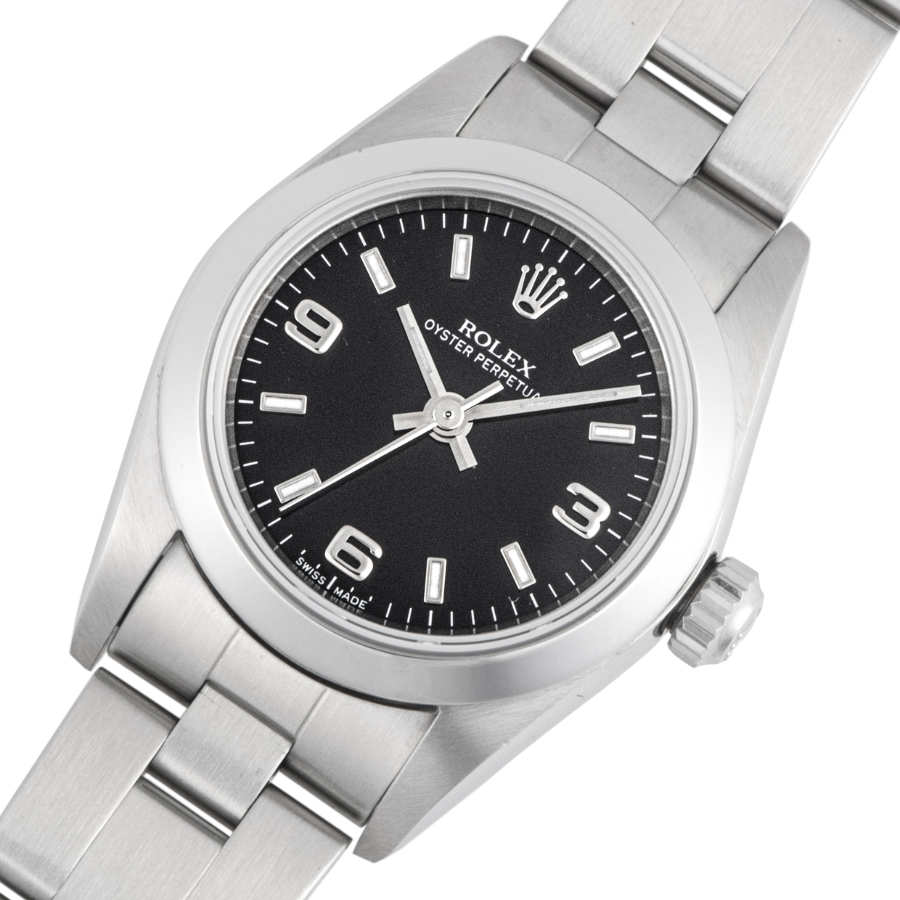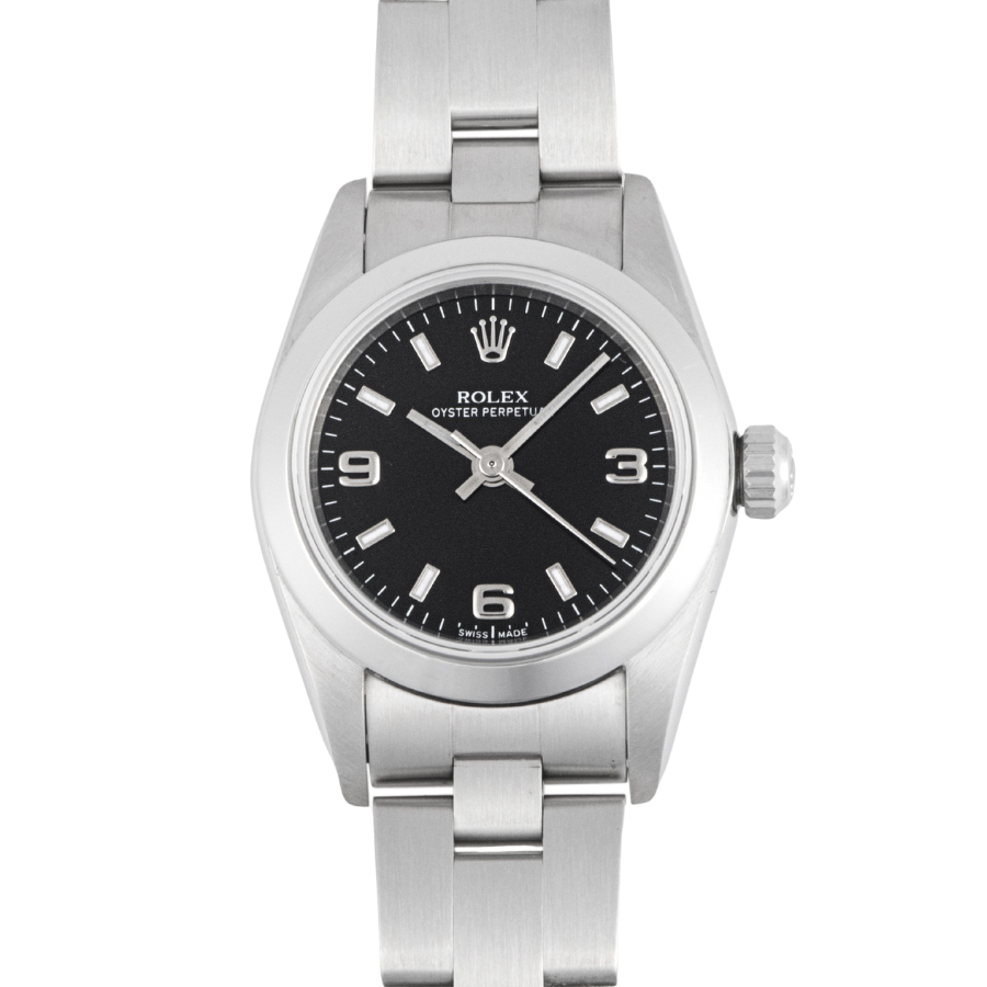 | 商品説明 | ☆レディースモデルで人気の高いオイスターパーペチュアルのブラックダイアルが入荷致しました。 ※外装仕上げ済みで目立つ大きな傷などなく大変綺麗な状態です。 ガラス風防に透かしがありません。 |