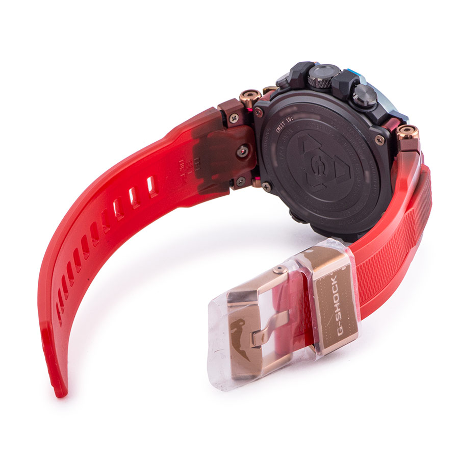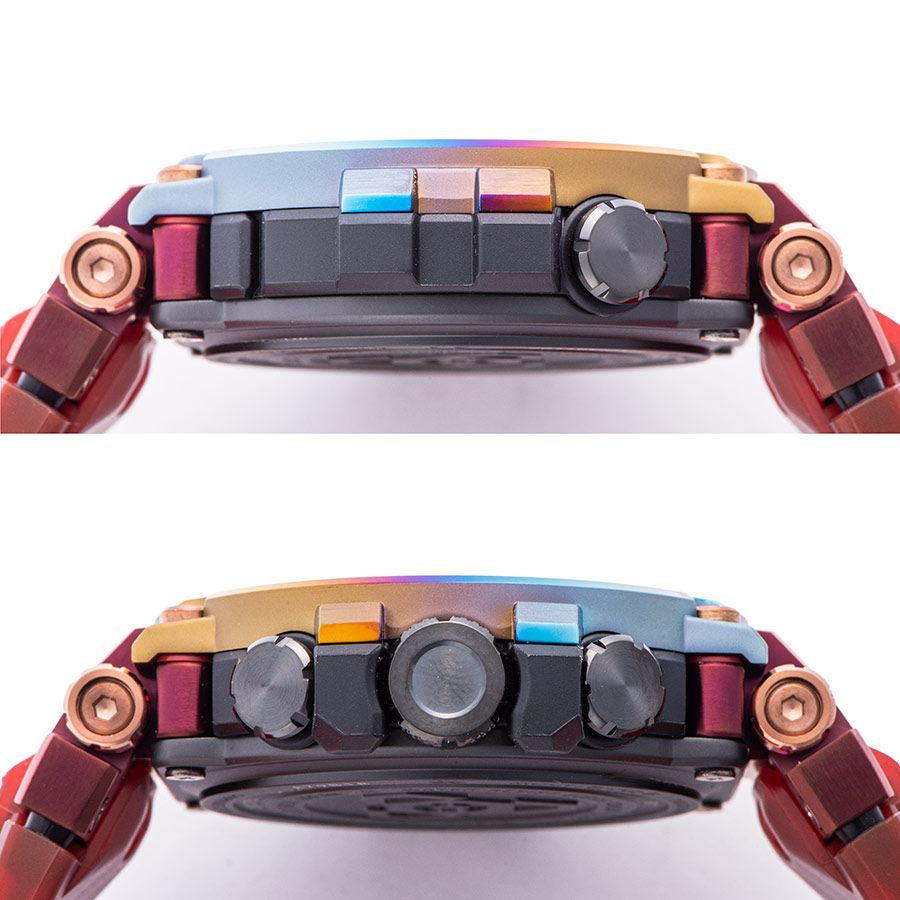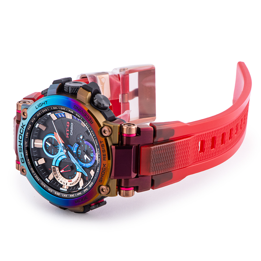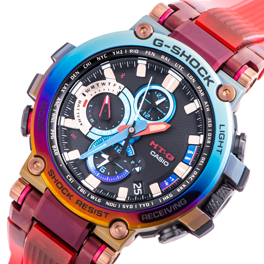 | 商品説明 | ☆今回のモデルは、火山の噴火によって発生する雷である「火山雷」を表現するため、レインボーIPを施したベゼルとマルチカラーの文字板、そしてMT-Gシリーズ初となるスケルトンレッドのソフトウレタンバンドを採用。 またこのレインボーIPは、特殊な環境で発生するこの現象のイメージと重ね合わせ、1点ずつ異なる色合いで表現しています。 |