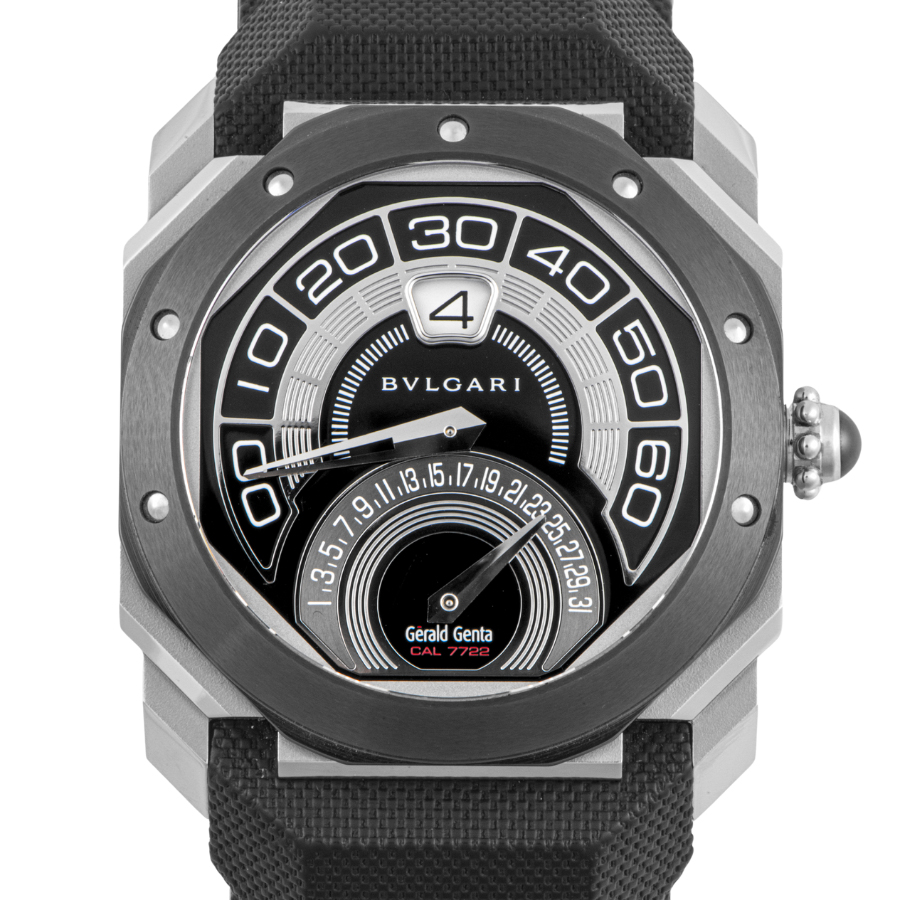 | 商品説明 | ☆時間表示はジャンピングアワー、分針とカレンダーはレトログラード機構による時間表示がジェラルド・ジェンタの作品らしさを出していて、メインロゴの「BVLGARI」の下にロゴとムーブメント名が入っています。 |