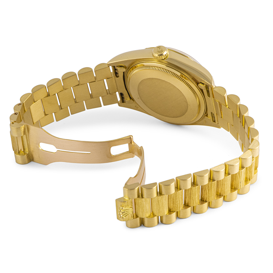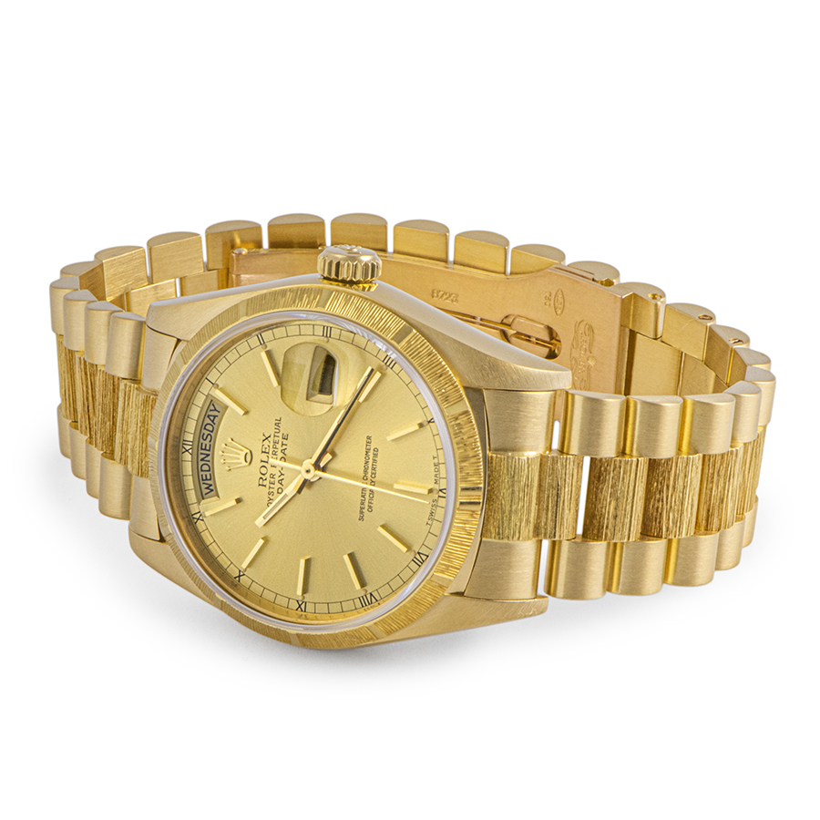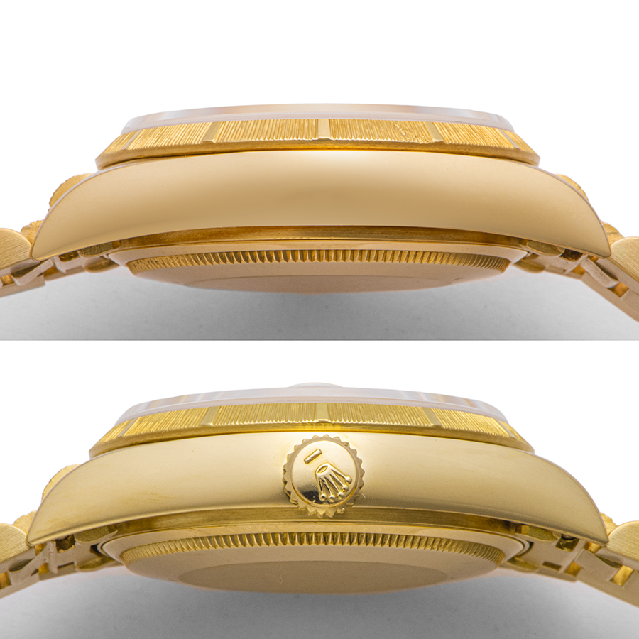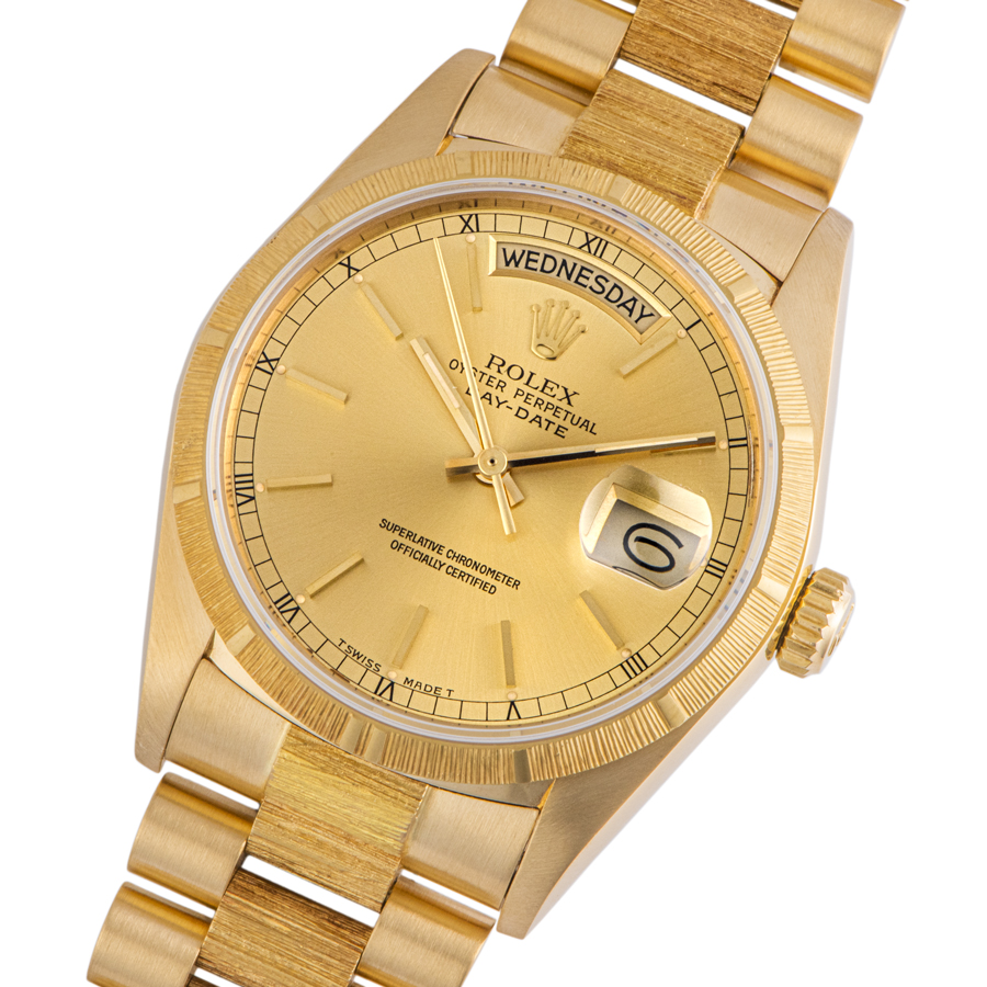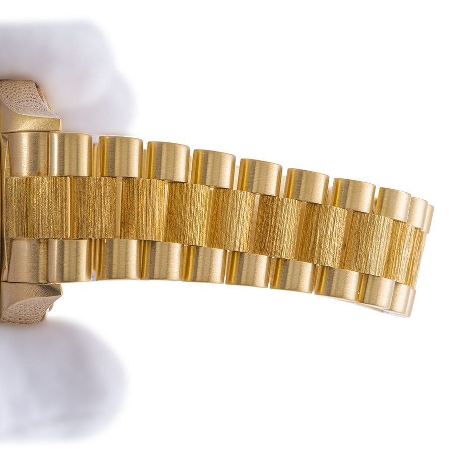 | 商品説明 | ☆イエローゴールド無垢のデイデイトが入荷しました。 こちらは、ベゼルとブレスレットの中央部にバーク仕上げが施されているのが特徴的です。 ※外装仕上げ済みで、特筆すべきダメージはなく大変綺麗な状態です。 |