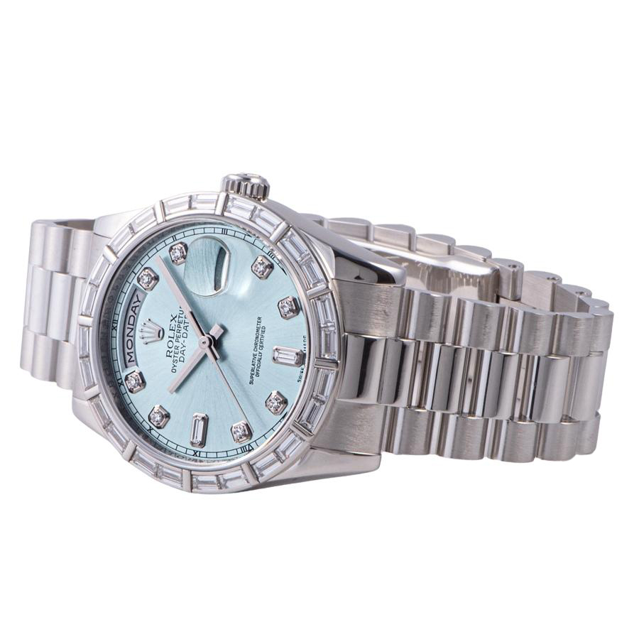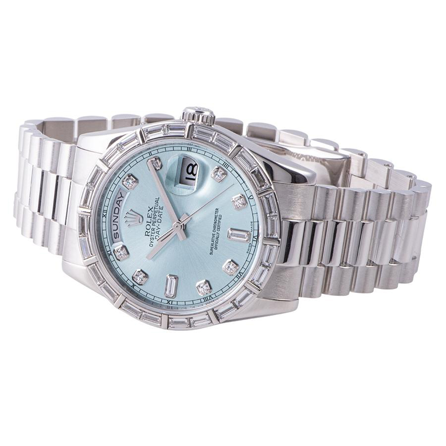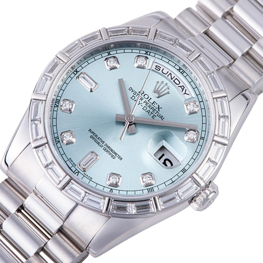 | 商品説明 | ☆Pt製無垢モデルにのみ存在するアイスブルーのデイデイトです。 ベゼルには24個のバケットダイヤがセッティングされ、大変上品なモデルとして存在感を放っています。 ※外装仕上げを行っておりますので目立つキズや凹みはありません。 |