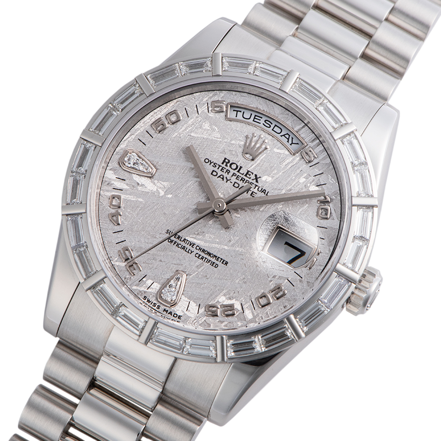 | 商品説明 | ☆隕石を薄く切り取り文字盤にしたメテオライトダイアルのプラチナ製のデイデイトです。 ベゼルには24個のバケットダイヤがセッティングされ、大変上品なモデルとして存在感を放っています。 ※6時方向の1コマ目にほんの小さな小傷がありますが、着用時目立たない程度です。 その他特筆すべきダメージなどなく大変綺麗な状態です。 2021/8にメーカーでオーバーホール済みです。 |