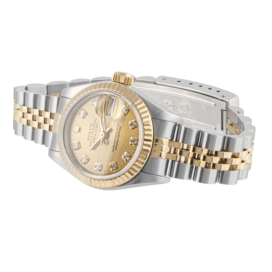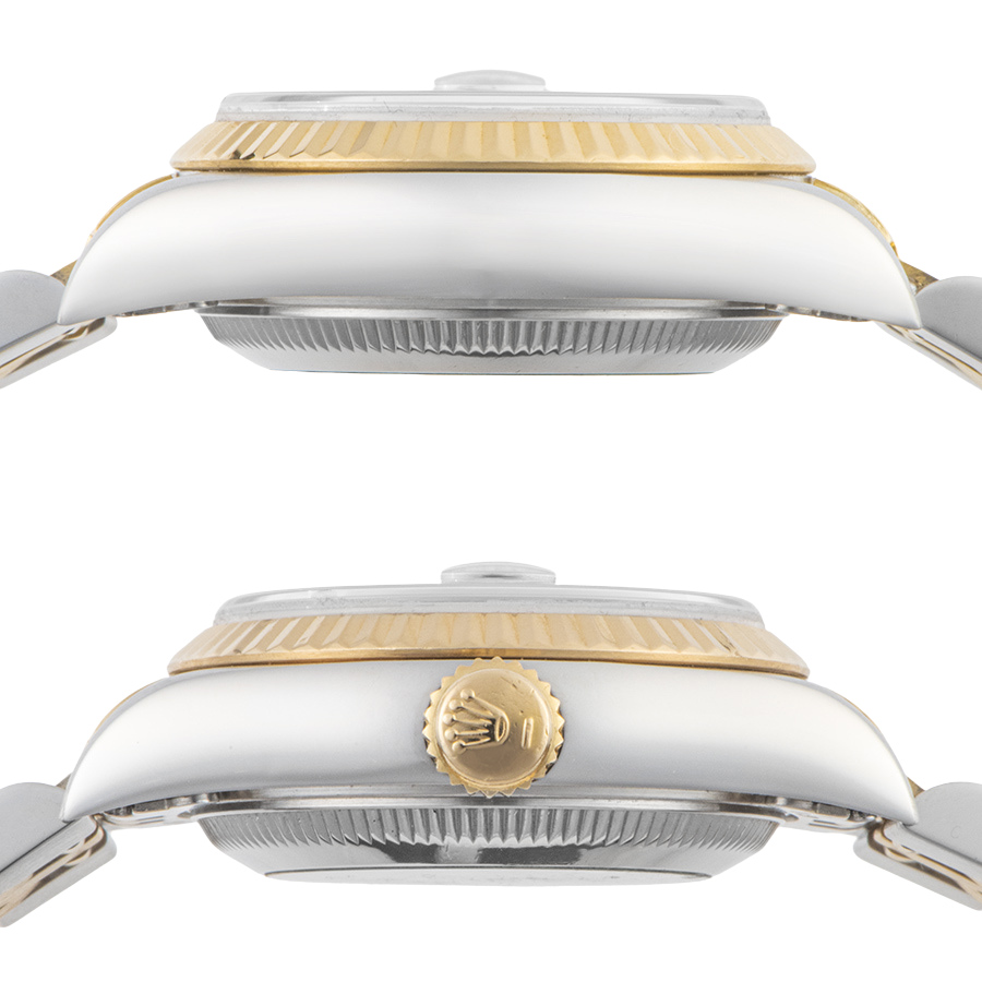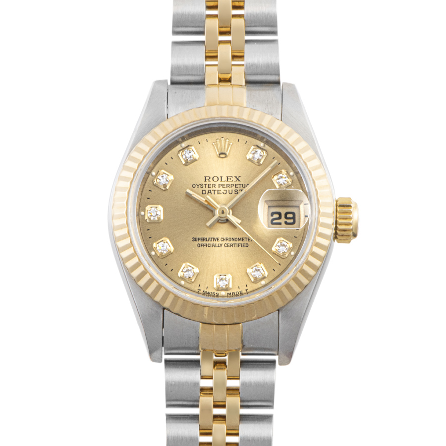 | 商品説明 | ☆イエローゴールドとステンレスのコンビモデルから根強い人気のシャンパン文字盤、10ポイントダイヤインデックスのモデルです。 レディースモデルの代名詞的な存在で、年齢を問わずお使いいただけます。 ※95年に製造されているのでブレスにやや伸びがあり、過去に何度か仕上げされているようで若干の痩せはありますが、目立つ大きな傷はなく全体に大変綺麗な状態です。 |