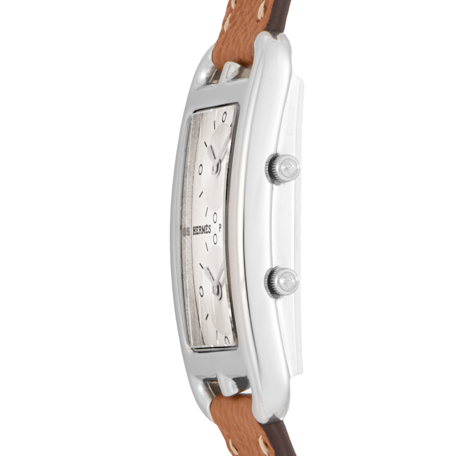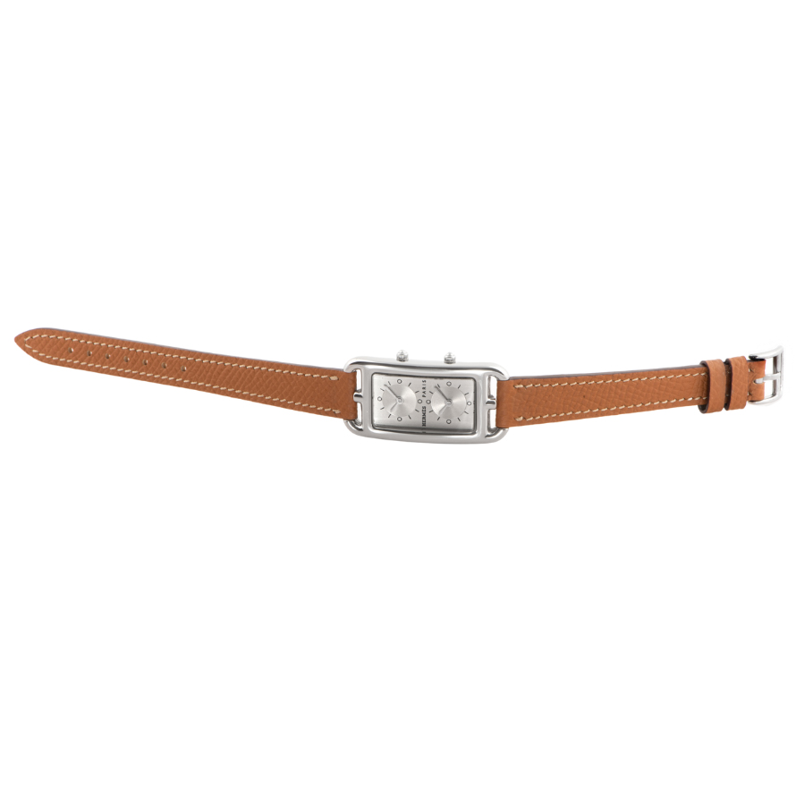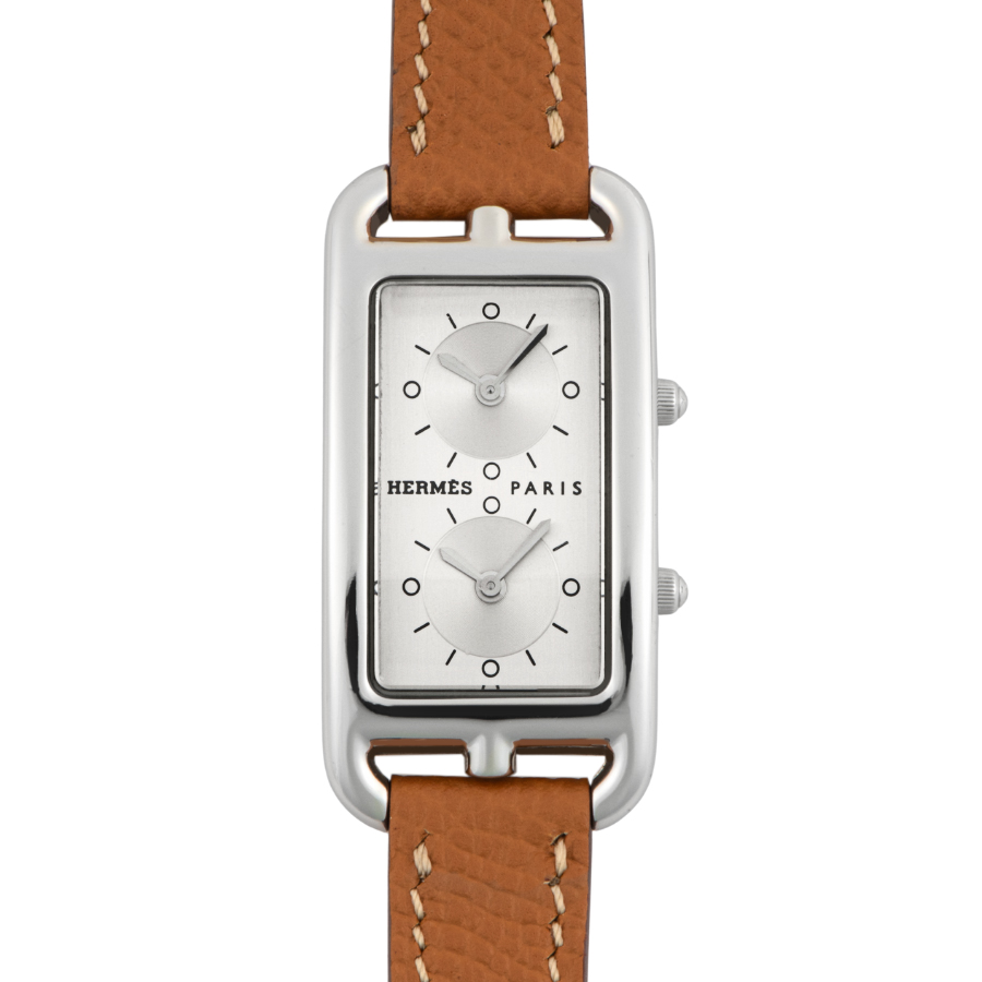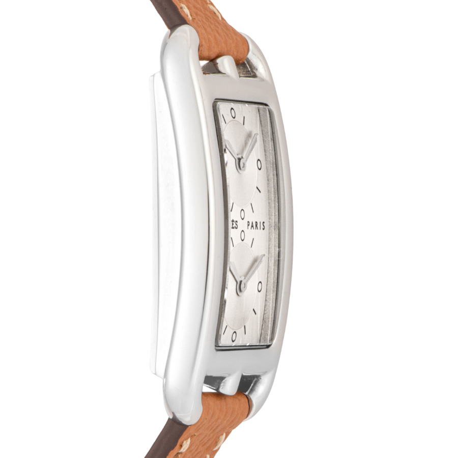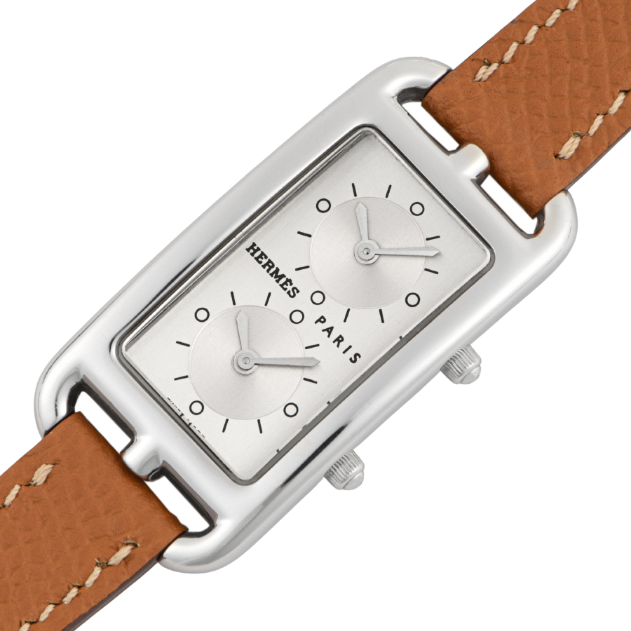 | 商品説明 | ☆エルメスの名作ジュエリー「シェーヌ・ダンクル」にインスパイアされた、アンリ・ドリニーによるデザインが光るケープコッド。長方形に正方形を重ねた独特のフォルムに、柔らかな曲線が融合し、気品とフェミニティを感じさせる一本です。 このモデルは、縦長ケースに2タイムゾーン表示を備えた「ドゥゾーン」仕様。2つのムーブメントが独立して時を刻み、旅先でもスタイリッシュに時を操ることができます。シルバーダイヤルにギョーシェ彫りが施されたインダイアルが美しい陰影を生み出し、知性と上品さを併せ持つ洗練された表情に仕上がっています。 |