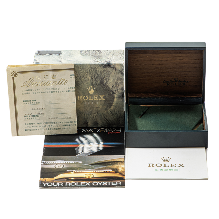 | 商品説明 | ☆「DAYTONA」の文字が12時間積算計上から少し離れた位置にプリントされた通称「フローティングダイアル」でビッグデイトナ表記 になります。 「6263」のシールが貼られた当時のオリジナルボックス、入手困難な当時のコスモグラフ冊子とロレックス冊子と付属もしっかり揃っており、保証書付きの大変珍しいモデルです。 |