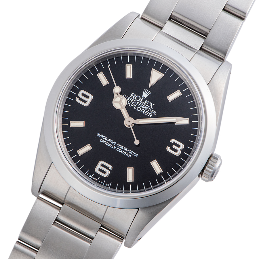 | 商品説明 | ☆生産終了モデルのエクスプローラーIです。 初期生産仕様の横穴ありタイプになります。 ※ベゼル10時方向の角に打ち傷が見受けられます。(画像参照No.7) その他に微細な拭き傷程度はありますが、目立つ大きな傷などはなく概ね綺麗な状態です。 夜光はルミノバとなっており暗所では光ります。 |