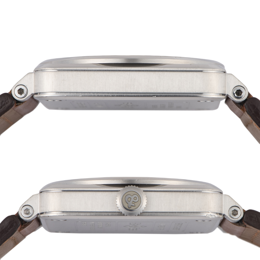 | コンディション | ガラス:欠けやキズはありません 文字盤、針:大変綺麗な状態 ベゼル:薄っすらと打ち傷がありますが目立つほどではありません ケース:ケース角1時位置に打ち傷があり、他にも打ち傷がポツポツとあります ストラップ:使用感はありますが全体に綺麗です 弊社にて研磨仕上げ済み |
