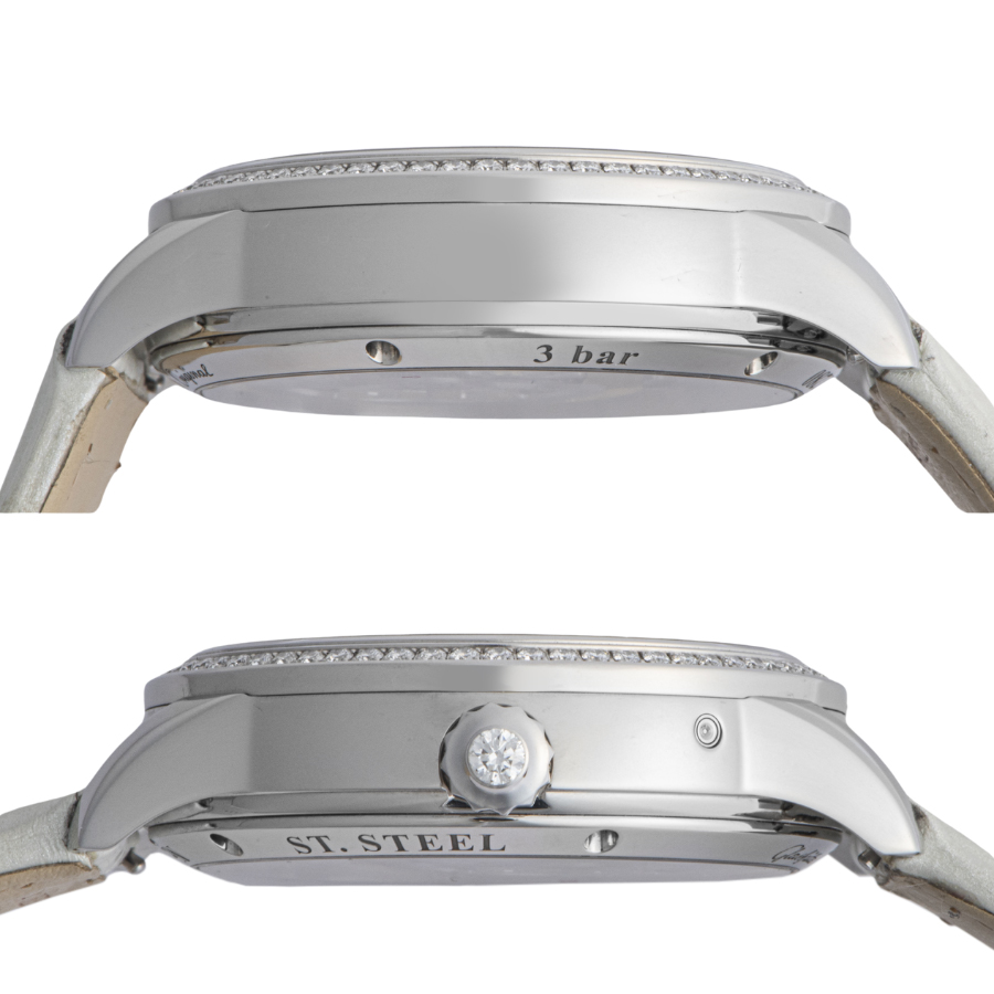 | 商品説明 | ☆パノマティックルナの特徴の一つは、黄金比に基づいたデザインの左右非対称な文字盤で、すべての針の軸が文字盤の左側に垂直に並び、右側には同じ高さで同心円状に並べられた 2 枚の表示ディスクで構成されているパノラマデイトとムーンフェイズディスプレーが配されています。 繊細に輝くマザーオブパールの文字盤では、銀色の月が軌道を描き、ベゼルのダイアモンドは星のようにきらめき、まさに天空の次元とも呼ぶべきものとなっています。 |
