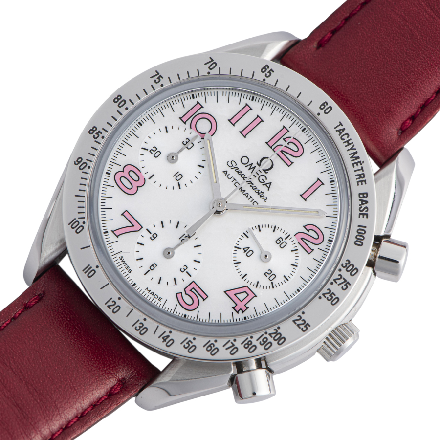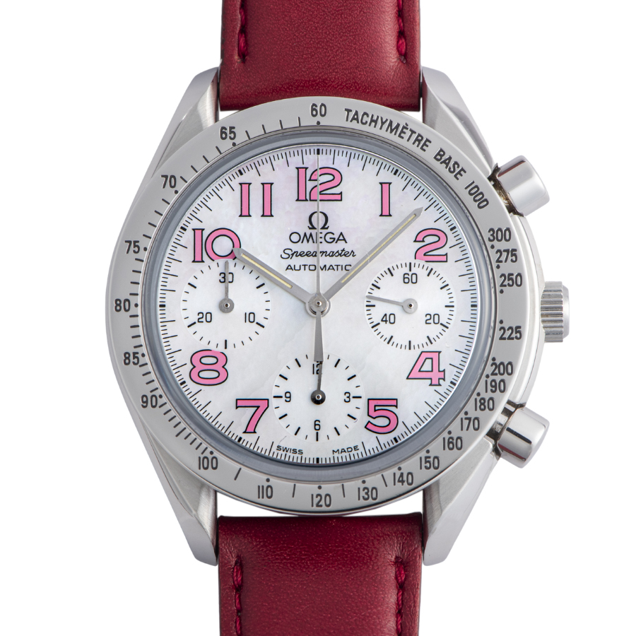 | 商品説明 | ☆オメガ定番の42mmサイズのスピードマスターのデザインを縮小し、39mmサイズの自動巻き。 こちらはシェルの文字盤にピンクのアラビアインデックスを使用した可愛らしいデザインのモデルです。 |