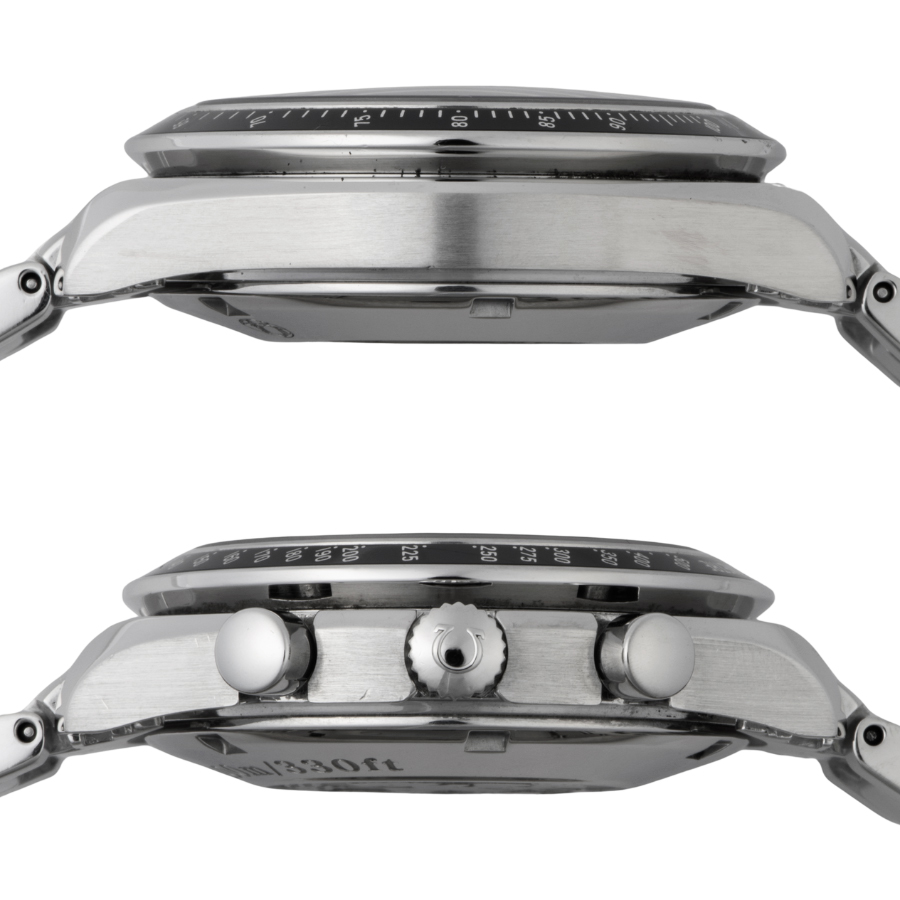 | コンディション | ガラス:欠けやキズはありません 文字盤・針:大変綺麗な状態 ベゼル:7時方向の角に着用時目立たない程度打ち傷が散見されます。使用傷はあるが、タキメーター部分にはダメージはなく概ね綺麗な状態 ケース:右側に小さな当て傷や小さな凹みがポツポツと残ります。その他の箇所には大きなダメージはなく概ね綺麗な状態 ブレスレット:目立つ大きな傷などなく大変綺麗な状態 ※弊社で研磨仕上げ済み |