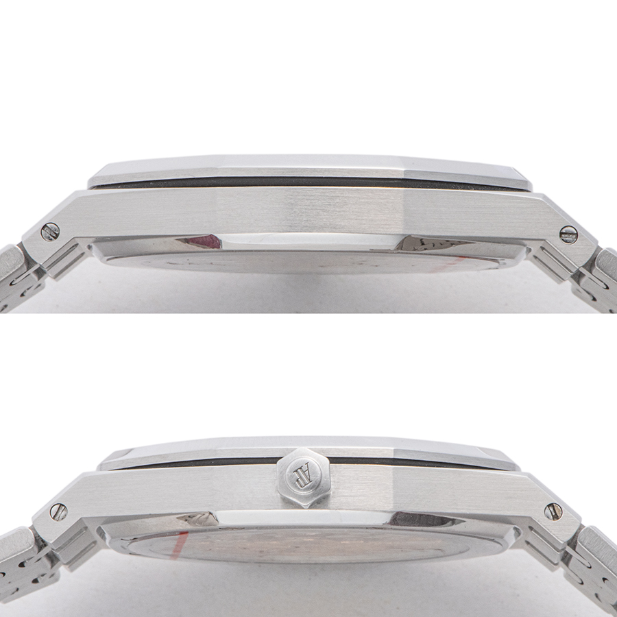 | 商品説明 | ☆市場でも数少ない、ロイヤルオーク ジャンボが入荷いたしました。 超薄型自動巻ムーブメント・Cal.2121を搭載し非常に薄くて軽く、39mmのケース径となります。 ※外装仕上げを行っておりますが、ケースサイド11時方向に着用時目立たない程度のほんの小さな打ち傷がわずかに残ります。 ブレスレットのバックル部分や12時方向2コマ目に使用に伴う小さな打ち傷がわずかに見受けられます。 その他の箇所には目立つ大きな傷などなく大変綺麗な状態です。 |