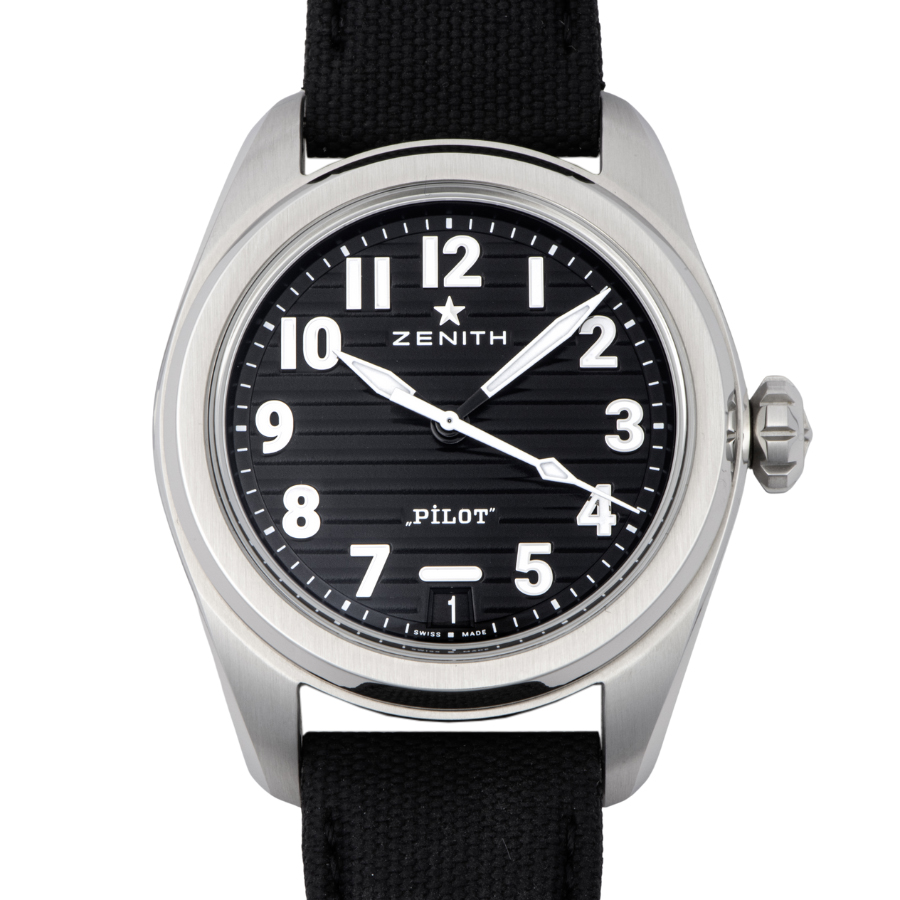 ☆ゼニス パイロット ウォッチの新世代モデルであるパイロット オートマティック スチールモデルは、スチール製40mmケース、大型リューズ、波型のブラック文字盤、スーパールミノバを塗布した大型のアラビア数字を備えています。