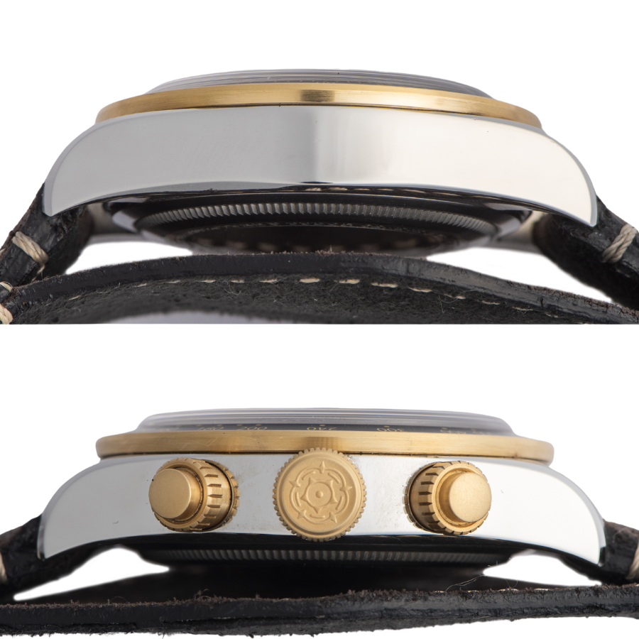 | 商品説明 | ☆チューダーの初期のサブマリーナに使用されていた通称“イカ針”を採用したブラックベイクロノが入荷しました。 ミリタリーテイストが強い革ベルトとSS/YGのコンビブレスのブラックダイアルがゴージャスな存在感を放つモデルです。 ※ケースサイドにはわずかな拭き傷程度はありますが、着用時目立たない程度です。 目立つ大きな傷などはなく大変綺麗な状態です。 純正革ベルトも使用感はほとんどありません。 |