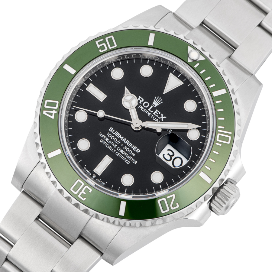 | 商品説明 | ☆116610LVがグリーン文字盤からブラック文字盤への変更。 文字盤にある、ドットのインデックスには青白い発光をするクロマライト夜光塗料を採用することにより視認性がアップされています。 70周年記念モデルとして従来の126610LVよりも明るいグリーンベゼルが特徴でございます。 |