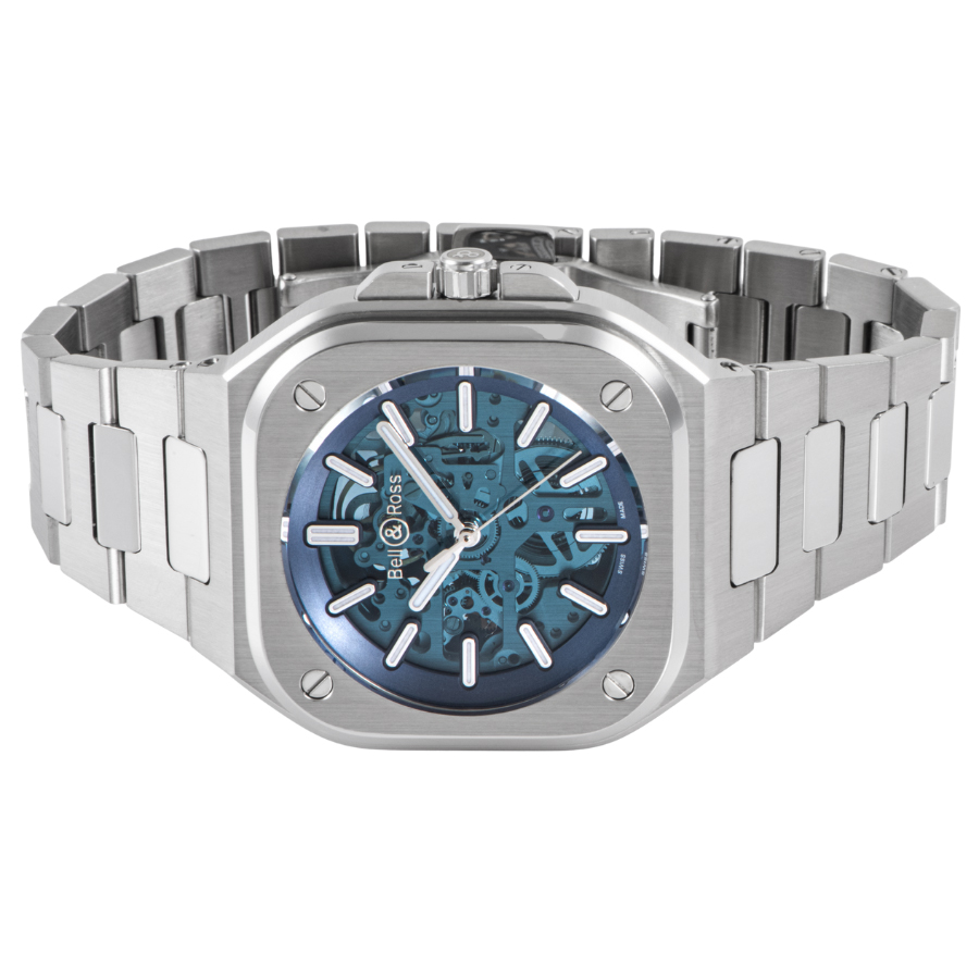 最大の魅力は、深いブルーのガラスを通して見えるスケルトン文字盤です。