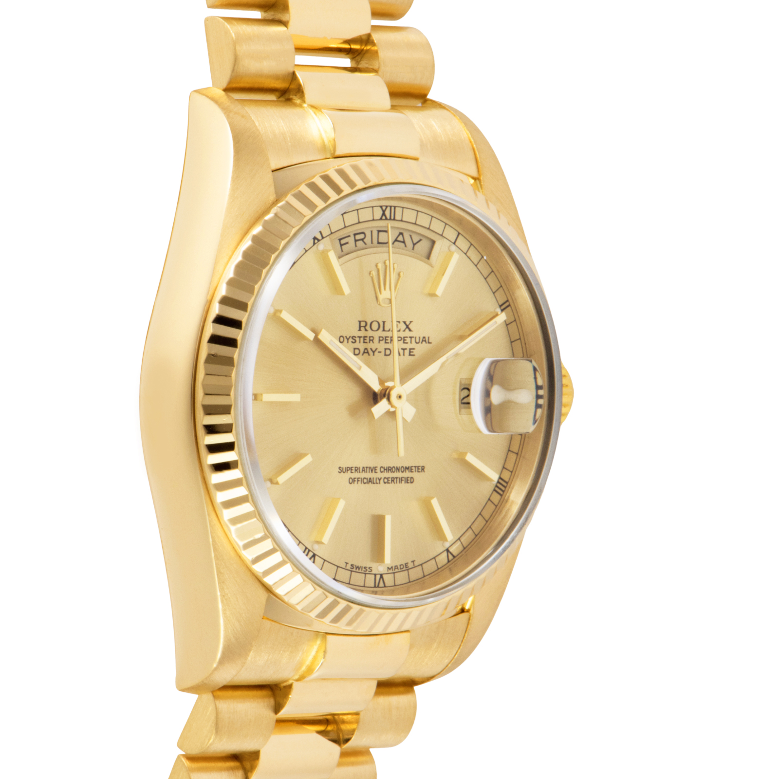 36mmケースにフルーテッドベゼル、曜日と日付をフル表示するデイデイト機構を搭載。重厚感と品格を兼ね備えたデザインは、まさにステータスシンボル。