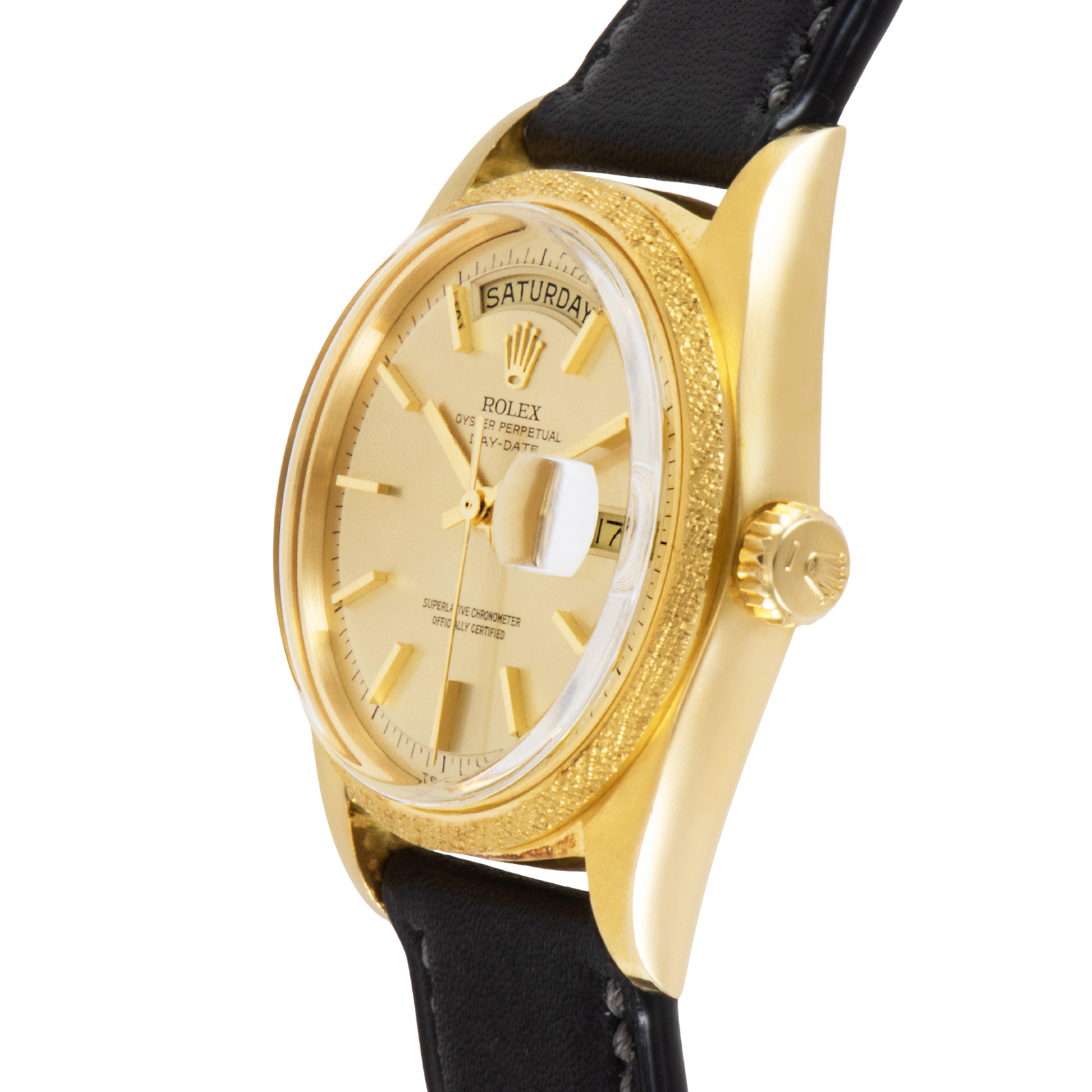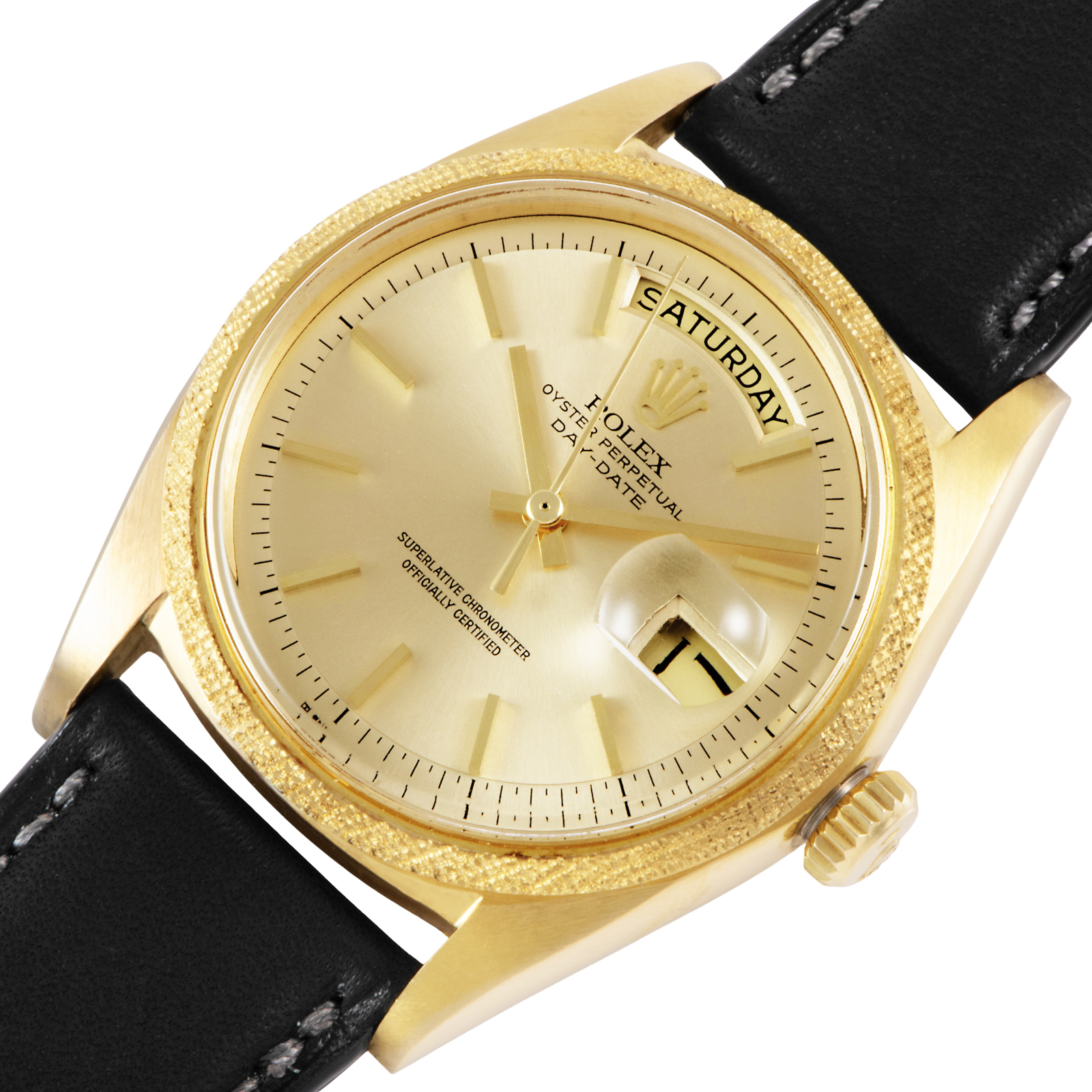 シャンパンダイヤルの上品さと、職人が一針ずつ刻んだような複雑な彫金が合わさり、現行品には出せない唯一無二のオーラを放っています。