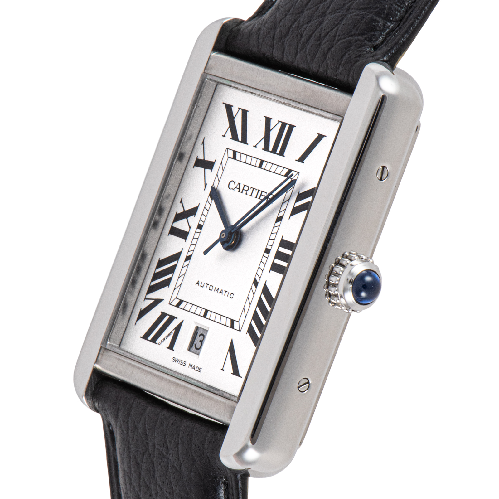 角型のステンレススティールケースに、象徴的なローマンインデックスとブルースチール針を組み合わせた端正な顔立ちは、ビジネスからカジュアルまで幅広いシーンにマッチします。