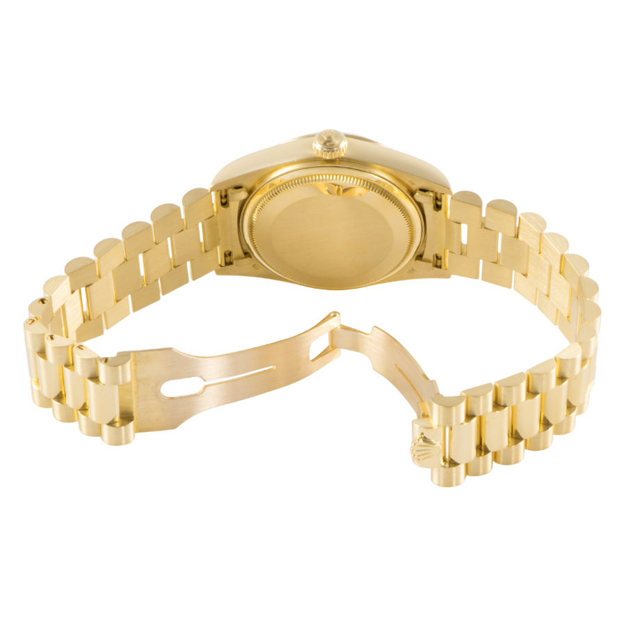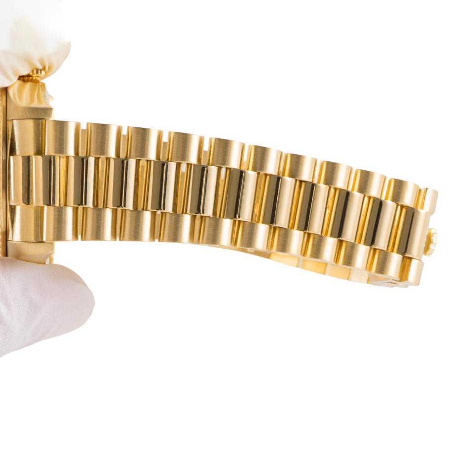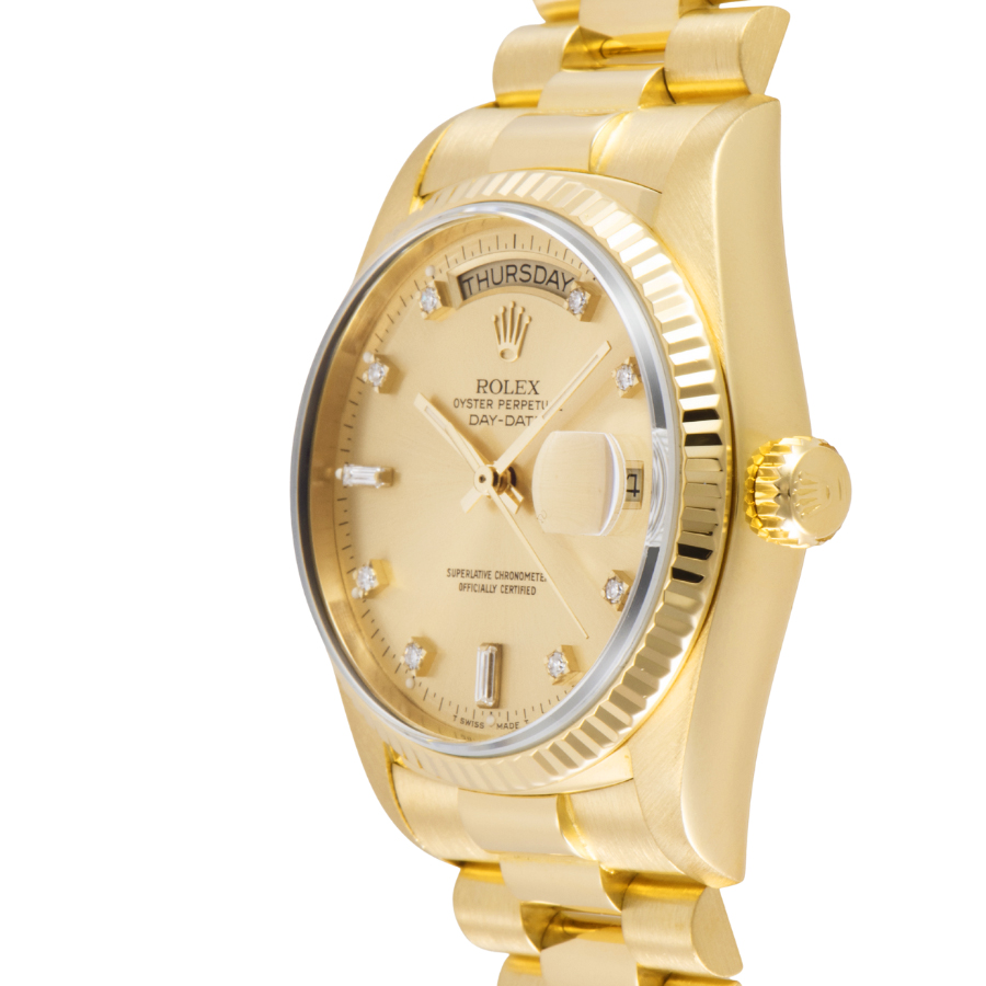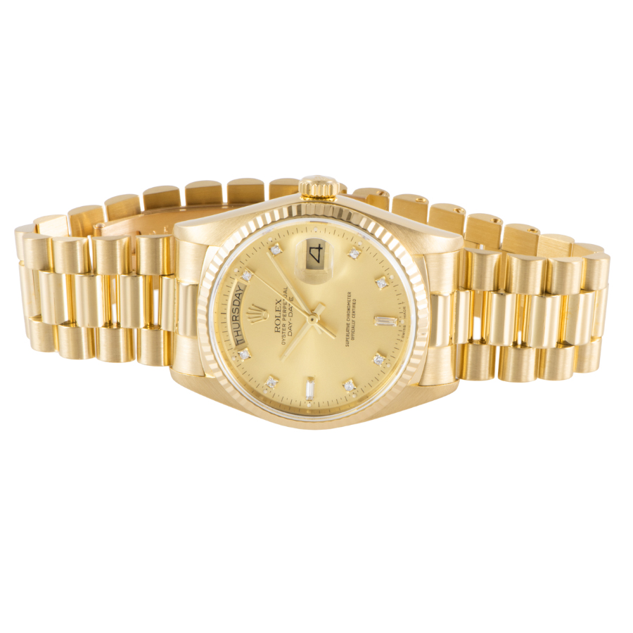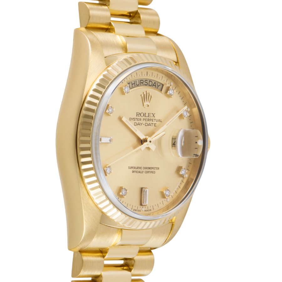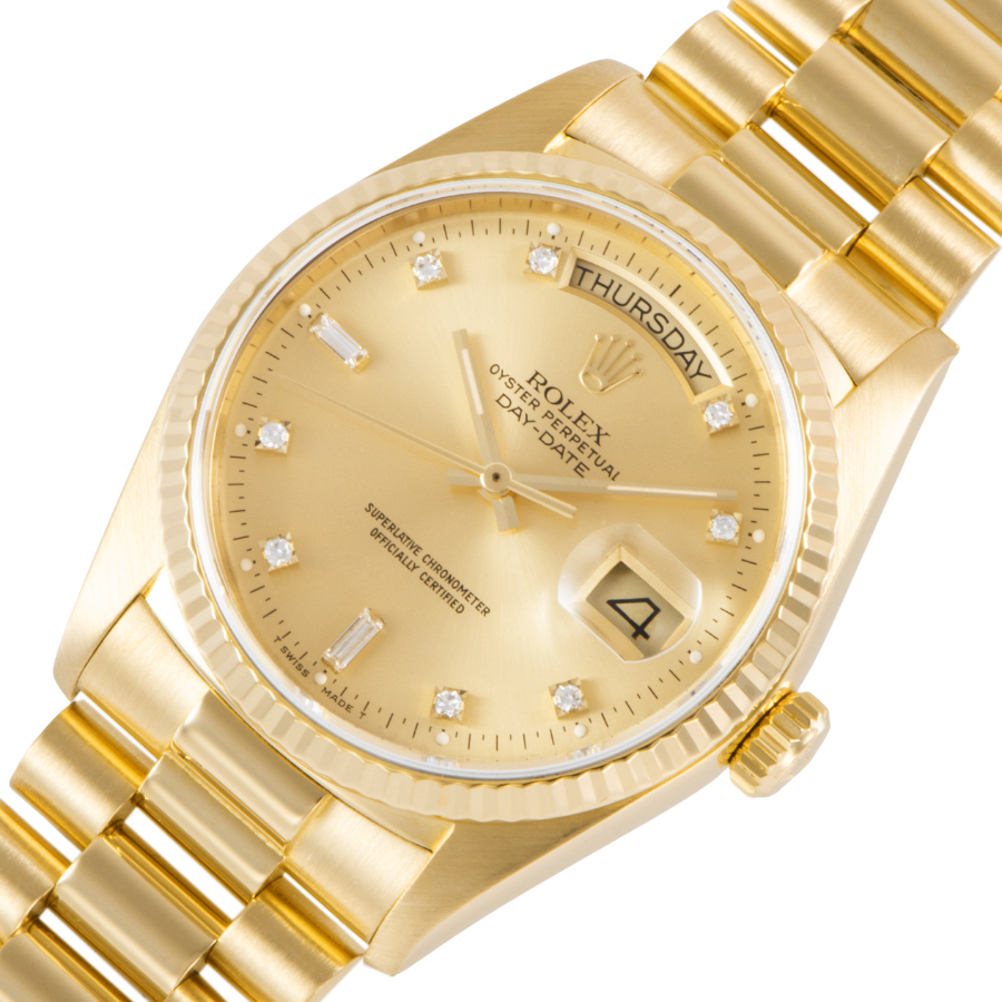 | 商品説明 | ☆ロレックスの最高峰ライン「デイデイト」。18Kイエローゴールド製ケースに、ダイヤモンドインデックスを添えた華やかな一本です。 36mmケースにフルーテッドベゼル、曜日と日付をフル表示するデイデイト機構を搭載。重厚感と品格を兼ね備えたデザインは、まさにステータスシンボル。 |