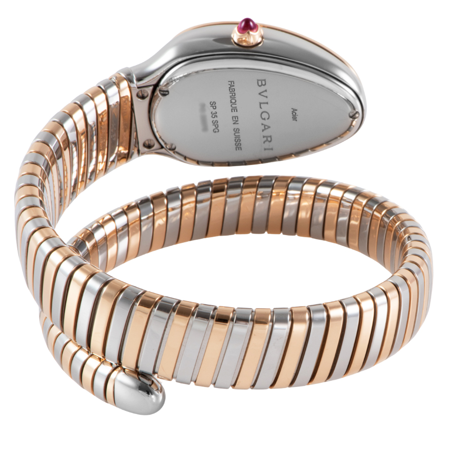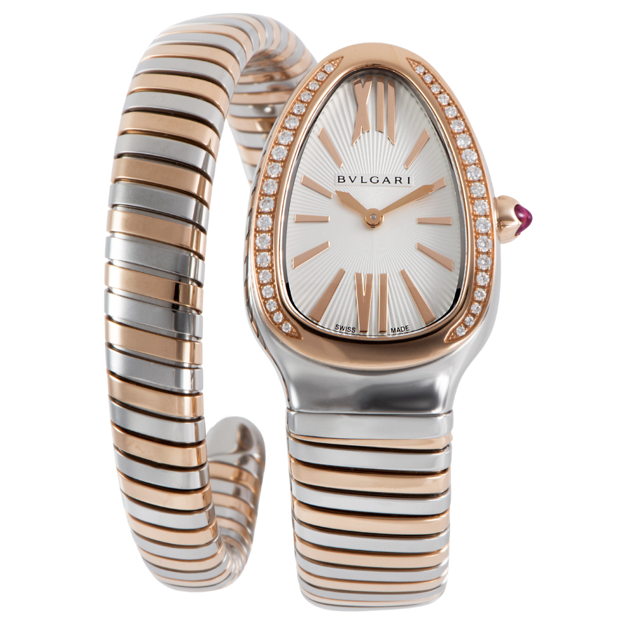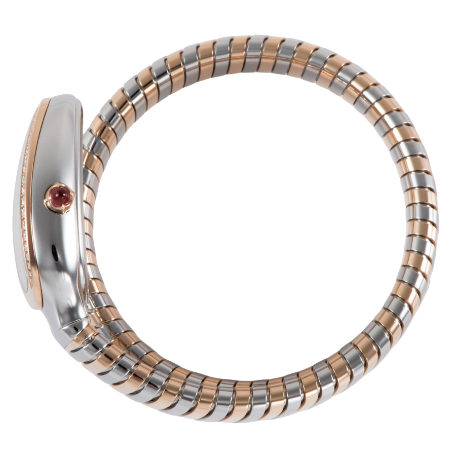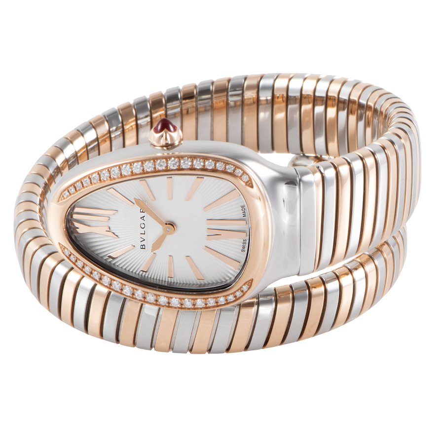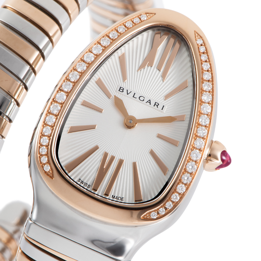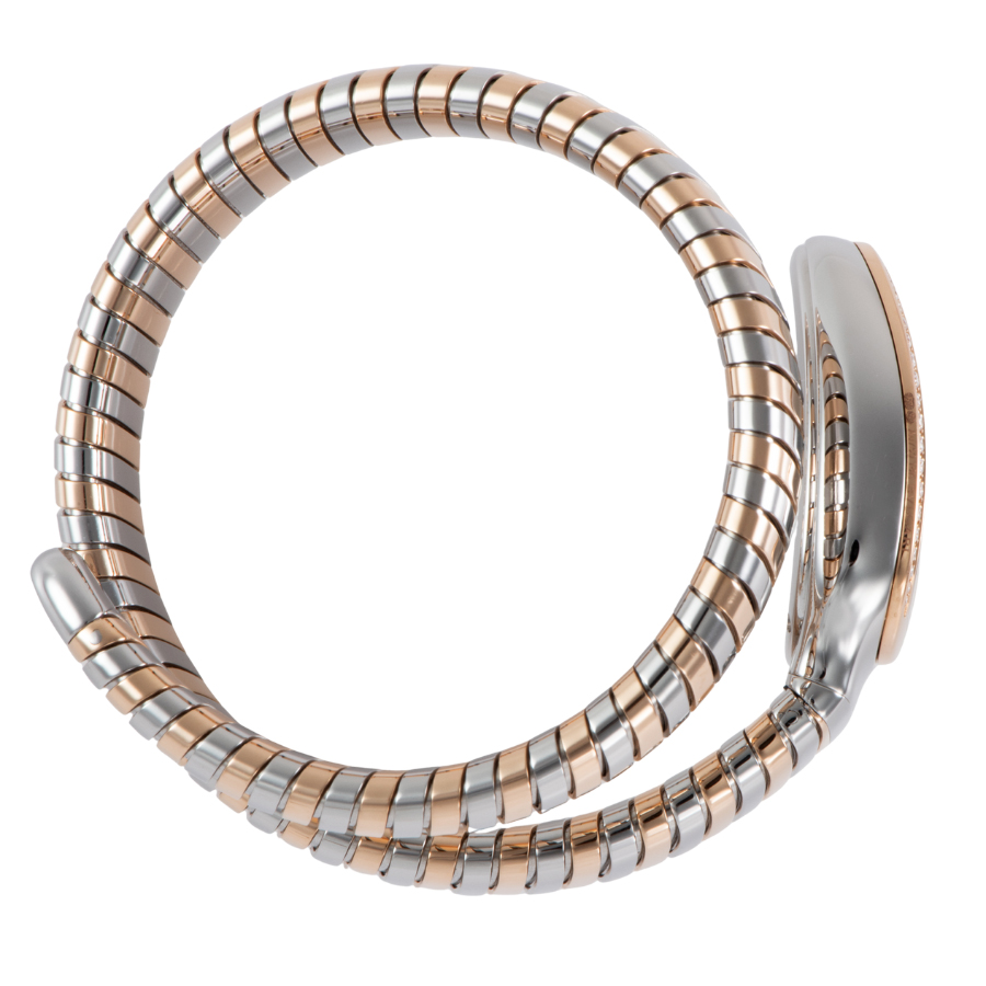 | 商品説明 | ☆古代ローマからインスピレーションを得た蛇(セルペンティ)のモチーフと、ガス管を模したしなやかな「トゥボガス」技法が見事に融合。 ピンクゴールドとステンレススティールのコンビネーションが、手元で圧倒的な存在感を放ちます。 ダイヤモンドをセッティングしたベゼルとシルバーオパラインのギョーシェ文字盤が、ジュエリーのような輝きを演出。 単なる時計ではなく、身に着ける人の内なる魅力と官能的な曲線を際立たせる芸術作品です。 |