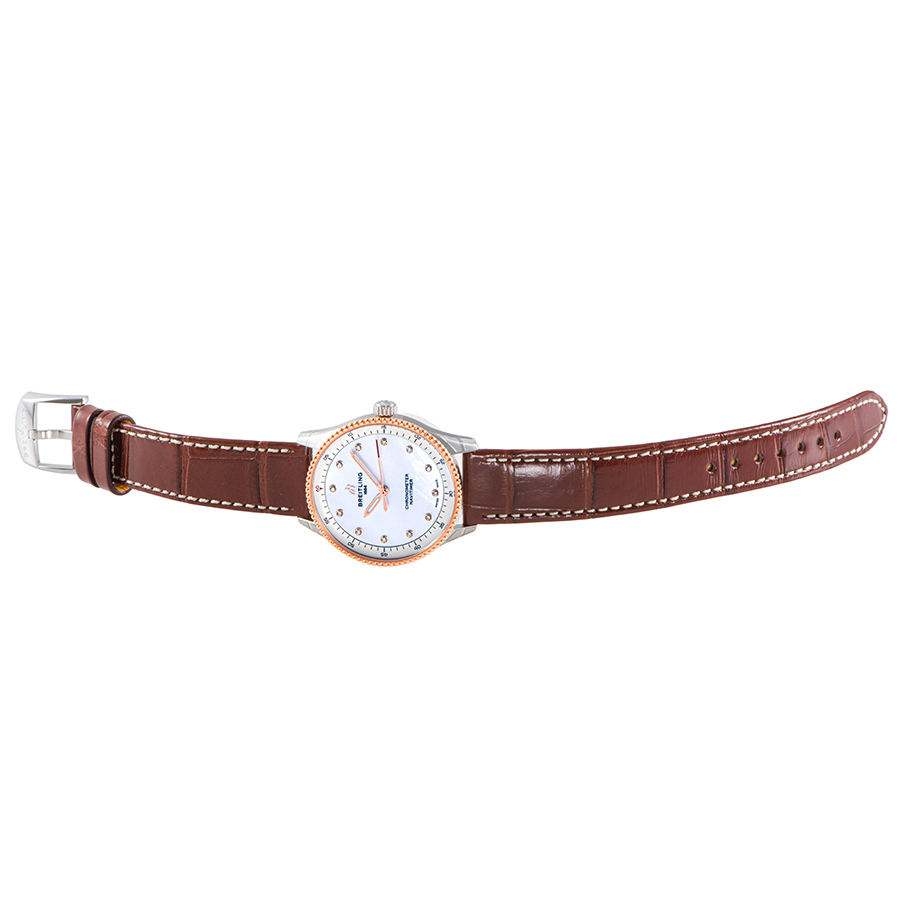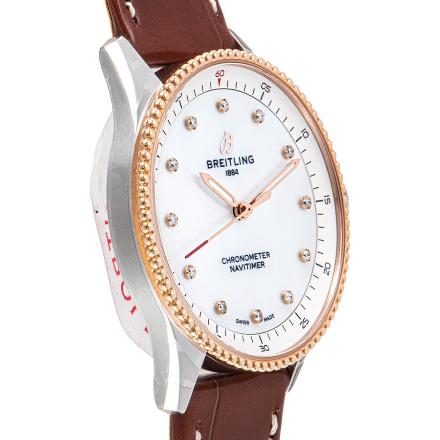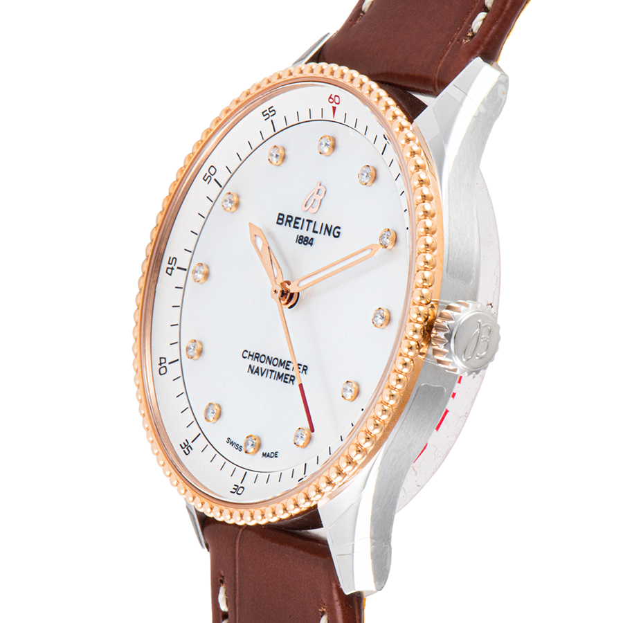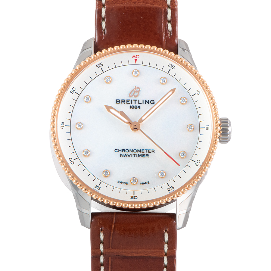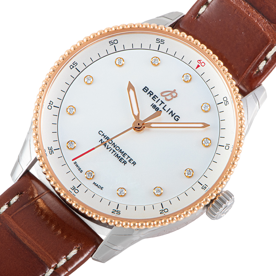 | 商品説明 | ☆ブライトリングのアイコンウォッチ「ナビタイマー」に捧げる、女性のための洗練されたモデルです。 直径32mmという繊細なサイズ感は、女性の腕元に優雅にフィットします。 18Kレッドゴールドとステンレススチールの美しいコンビネーションケースに、光の当たり方で表情を変えるホワイトマザーオブパール文字盤を組み合わせ、ダイヤモンドインデックスが煌めきを添えます。 航空計器としてのルーツを持つナビタイマーの象徴的な「ビーズ装飾ベゼル」はそのままに、ダイヤルデザインはシンプルに徹することで、ジュエリーのような魅力を放ちます。 高い精度を誇る温度補正スーパークォーツムーブメント(ブライトリング キャリバー77)を搭載し、機能美と華やかさを兼ね備えた、まさに大人の女性に向けた逸品です。 |