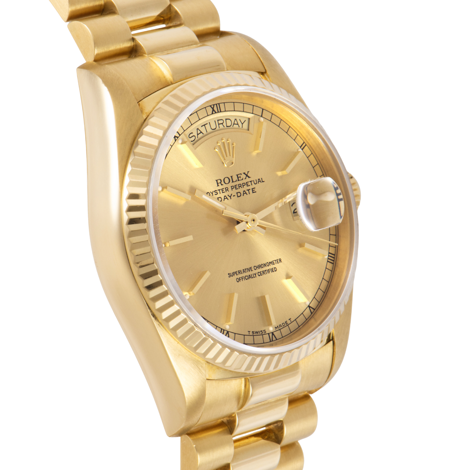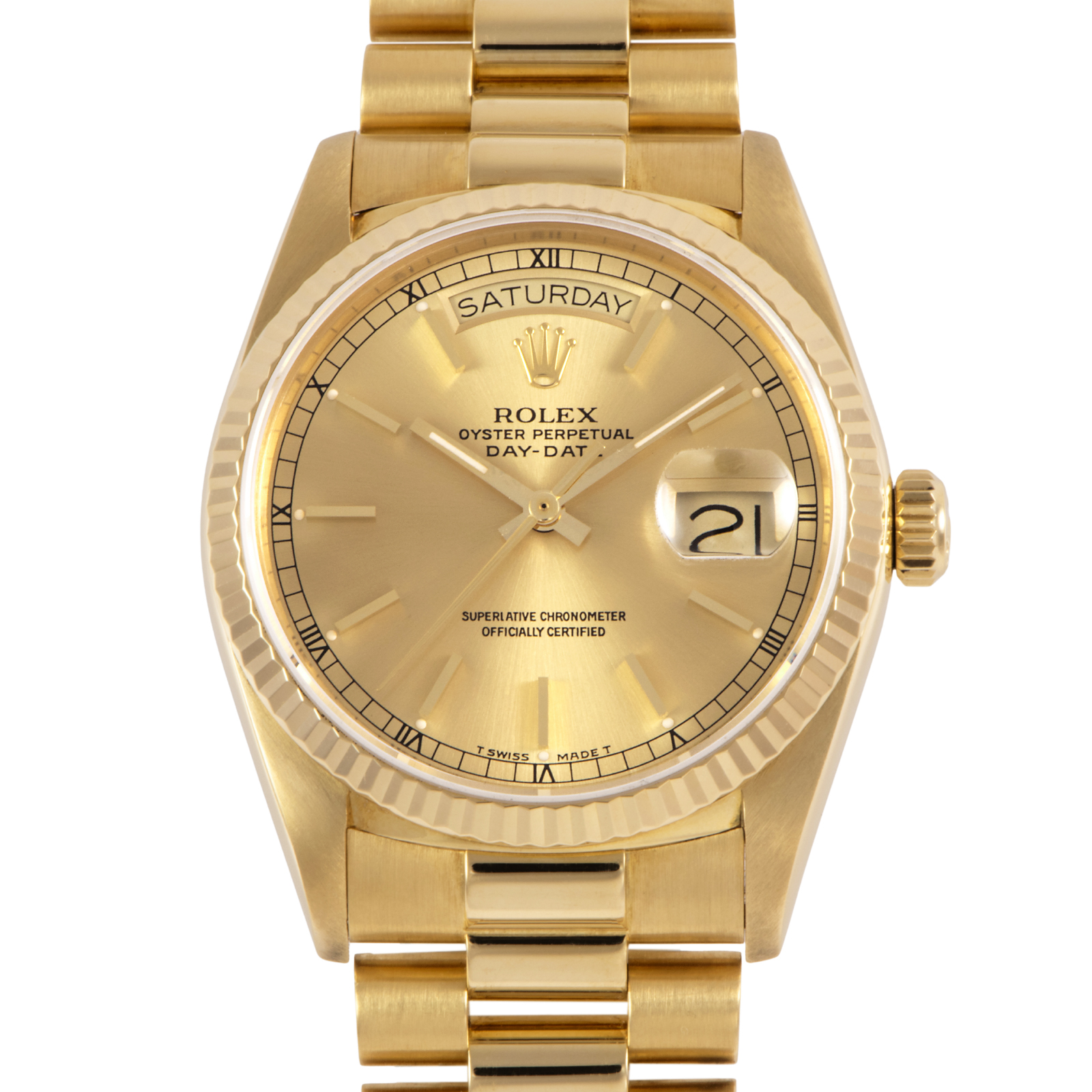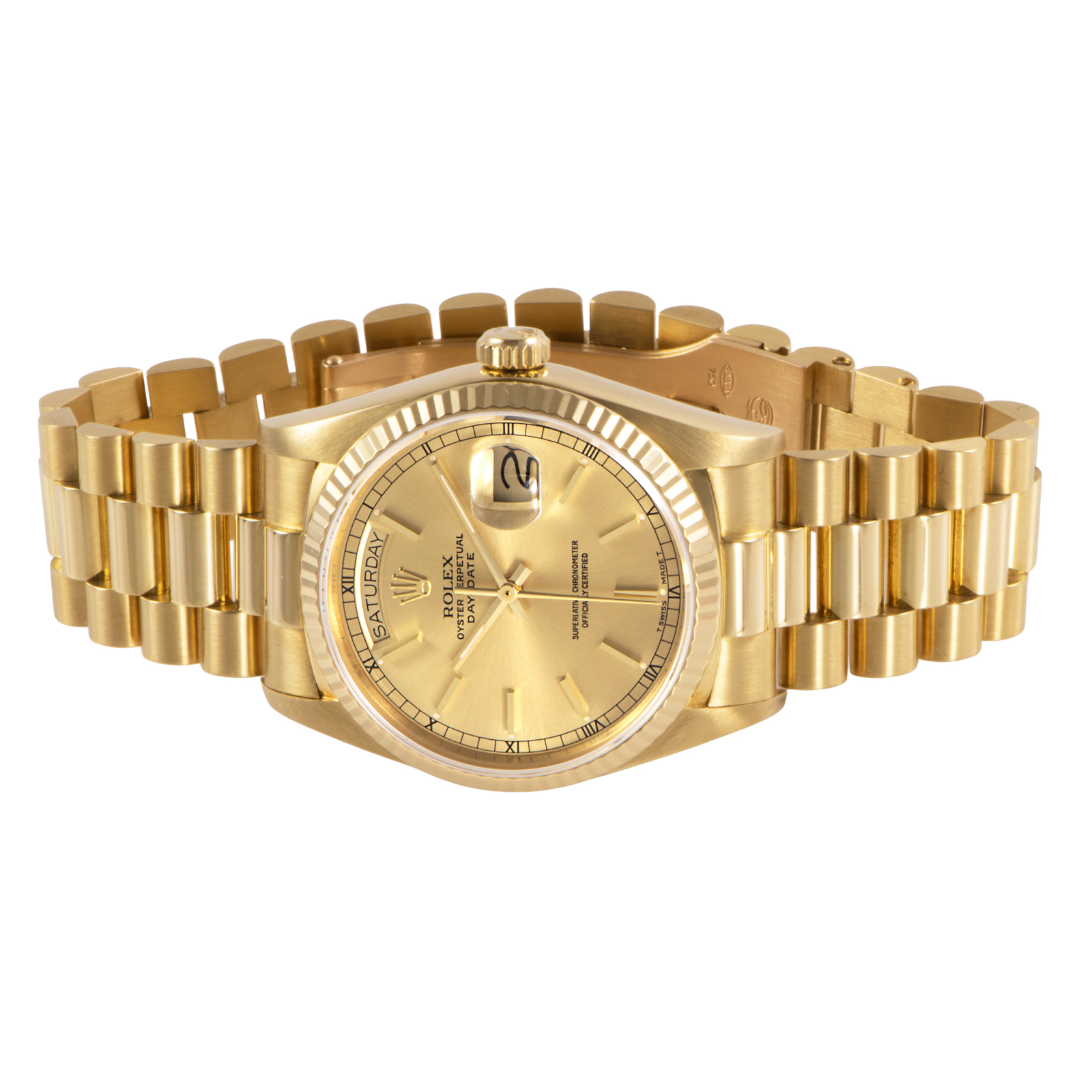 | 商品説明 | ☆ロレックスの最高峰ライン「デイデイト」。18Kイエローゴールド製ケースに、ダイヤモンドインデックスを添えた華やかな一本です。 36mmケースにフルーテッドベゼル、曜日と日付をフル表示するデイデイト機構を搭載。重厚感と品格を兼ね備えたデザインは、まさにステータスシンボル。 |