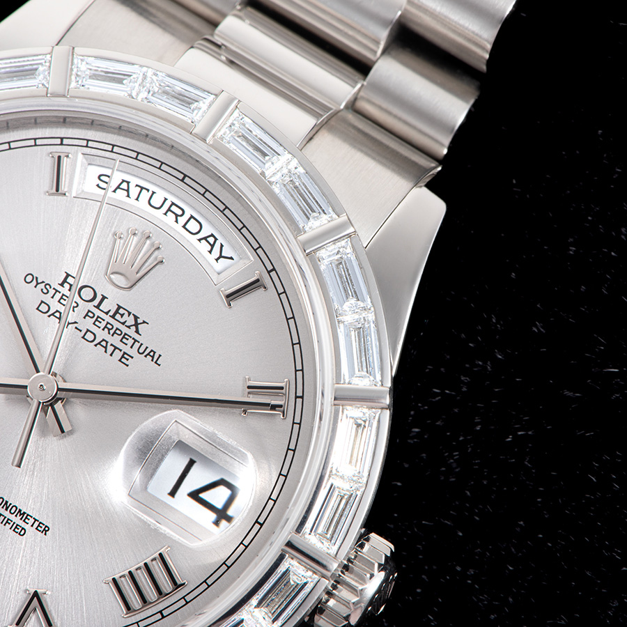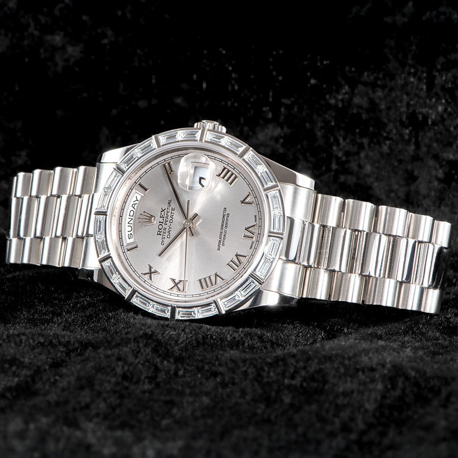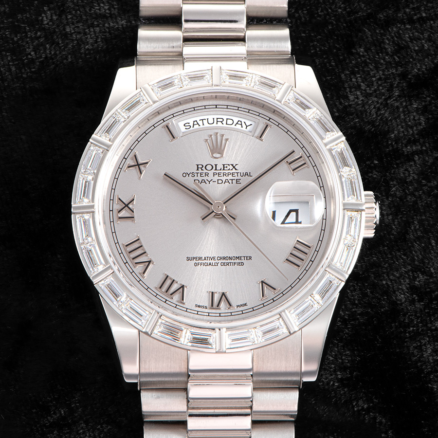 文字盤はグレー仕上げのほか、プラチナモデル専用のアイスブルーダイヤル仕様も存在し、クラシックなローマンインデックスやダイヤモンドインデックスを組み合わせたバリエーションが展開される。12時位置の曜日表示と3時位置の日付表示はデイデイトの象徴的意匠であり、バゲットダイヤモンドの輝きとともに端正な表情を作り上げている。36mmのケースサイズは控えめでありながら、華やかさと風格を兼ね備え、強い存在感を示す。