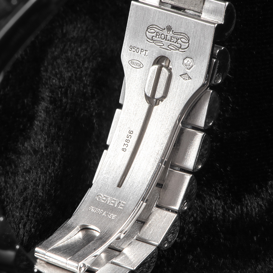 Ref.118366の最大の特徴は、素材と装飾にある。ケースとブレスレットには純度95%の“950プラチナ”が使用され、残り5%にはルテニウムなどを加えて硬度と加工性を高めている。プラチナは比重約21.45と非常に高く、装着時の重量感が強い存在感を示す。輝きは冷たく落ち着いた白銀色であり、華美さを抑えつつ気品を放つ。傷はつきやすいが、磨き直すことで金属を失うことなく光沢を取り戻せる点も魅力である。