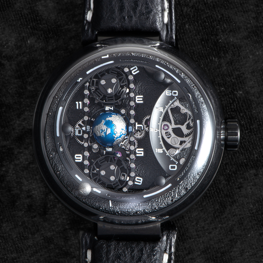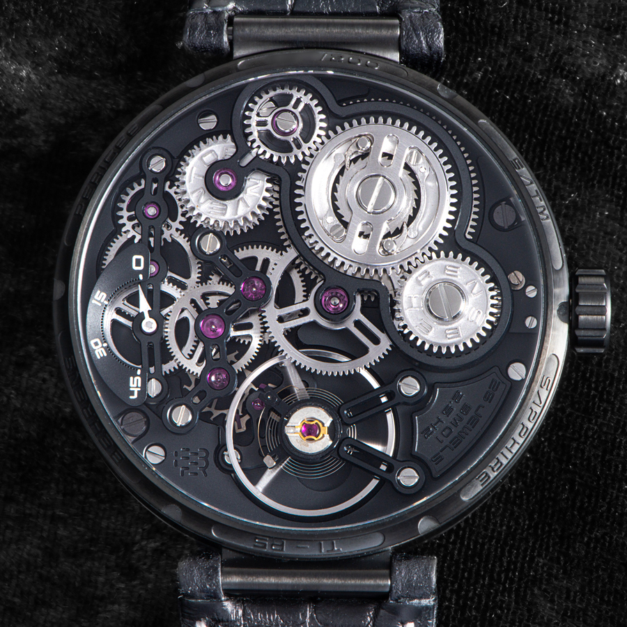 ケースは軽量かつ堅牢なグレード5チタン製であり、直径43mmという存在感を持ちながらも、驚くほどの軽さと高い装着感を実現している。 スケルトン構造の奥では、自社製手巻きムーブメント「BM01」が精緻に鼓動し、ブリッジや歯車の繊細な動きが“時計”という枠を超えた芸術的存在として響いている。