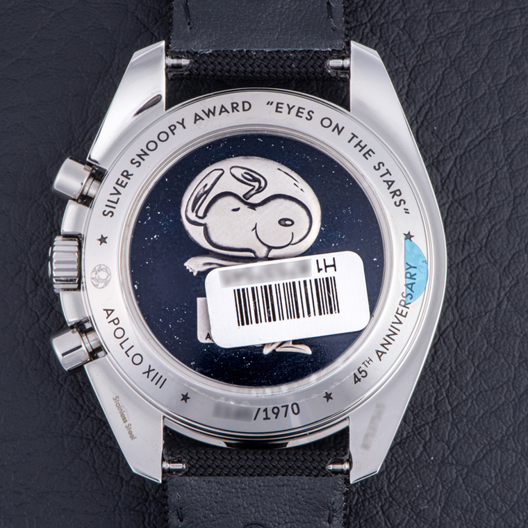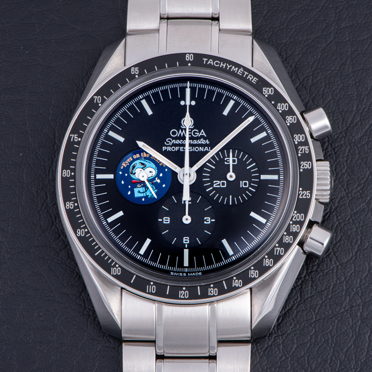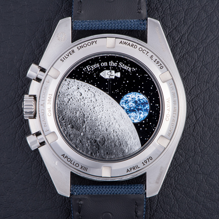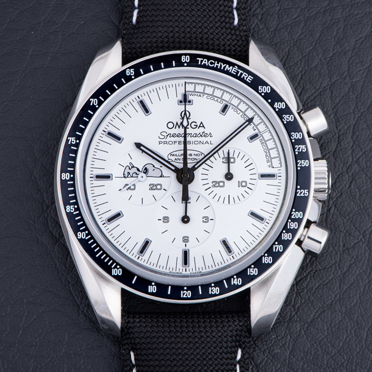 ダイヤル上には、9時位置にスモールセコンドのスヌーピーのイラスト、0~14秒のインデックスに漫画のコマ割りと「What could you do in 14 seconds?(あなたは14秒で何ができたか?)」というメッセージを記した。ここでの14秒とは、アポロ13号の飛行士たちが大気圏再突入の前に、船内で「スピードマスター」を用いてエンジン噴射を測定した時間を意味する。中央には、1995年に公開された映画「アポロ13」で、名優エド・ハリスが演じるアポロ13号の主席管制官ジーン・クランツが口にした「Failure is not an option.(失敗は許されない)」というセリフのプリントが施されている。